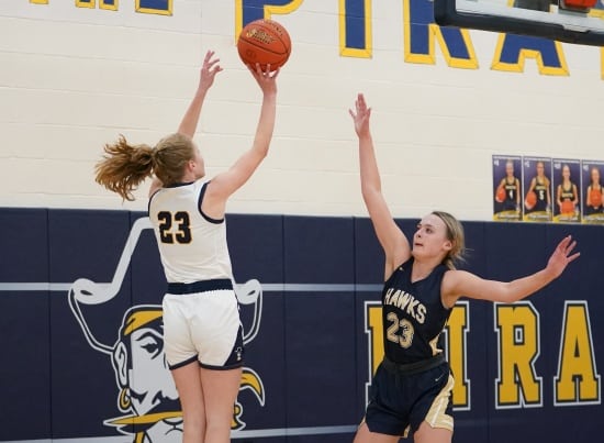 Crookston used solid defense while forcing several turnovers and was efficient on the offensive end while jumping to a 17-2 lead when Hermantown called a timeout with 10:16 left in the half. Â In the run, Crookston was led by Halle Winjum’s eight points, Emma Gunderson added five, and Abby Borowicz and Naomi Johnson added two each for the lead. After the time out, Crookston’s Boll added a free throw for an 18-2 lead. Â Hermantown, who played in Thief River Falls on Friday night, started to settle in, and Lauryn Biondi made back-to-back baskets to bring the Hawks within an 18-6 deficit while forcing Crookston to call a timeout. Â After the time-out, Halle Winjum converted a three-point play, and the teams exchanged baskets for the next five minutes, and the Pirates led 25-14 with 2:31 left in the half.