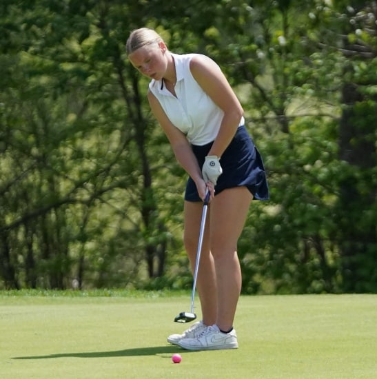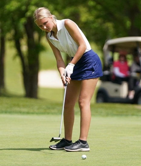 ADDIE FEE – The junior had a solid day and shot an 85, good for 12th place overall. Addie had a birdie with a four on the par five fourth hole. She also had five pars, 10 bogies, and two double bogies. Addie, who shot a 39 on the front nine, is two strokes out of making the cut to go to state.