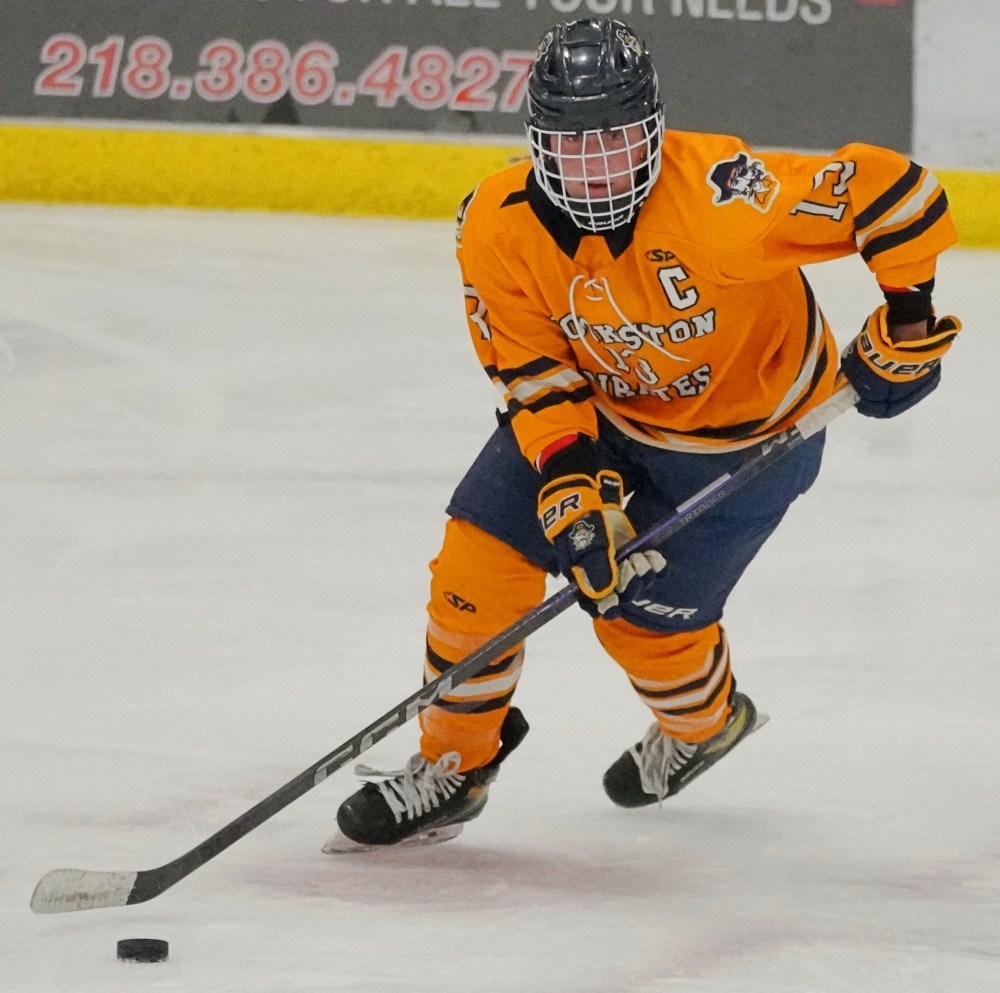 Crookston had a few quality scoring chances the rest of the period, but couldn’t get one past the Storm goalie. North Shore’s Reese Costly had the puck behind the Pirate net and slid a pass into the slot as Hayden Bright fired a one-timer into the net to tie the game at 1-1 with 51 seconds left in the period.