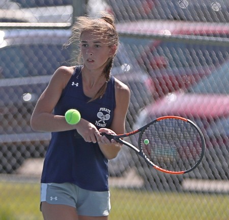 The Crookston Pirate Girls Tennis team finished 5th place at the Crookston Pirate Booster/Carla Johnson Memorial tournament held on a warm and windy day in Crookston at tennis courts throughout the town. Six points separated the top six teams and Perham won the tournament with 22 points, one point better than New London-Spicer.Ā “It was an even tournament up and down the board,” said Pirate Coach Cody Brekken. “It was tight until the end and a lot of good tennis.”