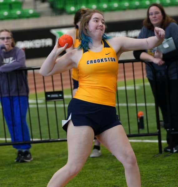Also gaining points for Crookston was the 4X200 Relay team of Chloe Boll, Grace Boll, ZiiZii Sam, and Emma Gunderson who took 5th place with a time of 12:38.04. Maddie Harbott finished 6th place in the 3000 Meters with a time of 16:49.72, and Libby Salentine took home a 7th place finish in Shotput.