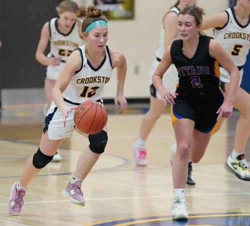 The start of the second half continued to be a back-and-forth battle, but Crookston outscored the Titans 12-8 in the first seven minutes for a 43-20 lead with 10:34 remaining. The teams continued to trade baskets, and Crookston led 52-31 when the Titan’s Sophie Lien made a three-pointer for the 1,000th point of her career to bring her team within a 52-34 deficit with four minutes remaining.
