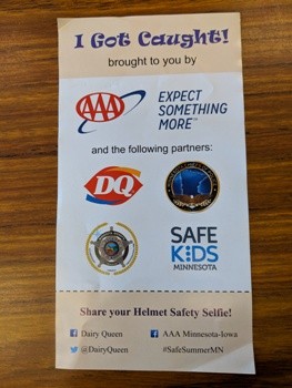 Safe Kids Minnesota also sponsors the program. Biermaier said brain injuries are preventable. “Some of the reasons wearing a helmet is so important is that kids who suffer brain injuries can die,” said Biermaier. “Wearing a helmet can decrease brain injuries by 88 percent, so it’s pretty significant. Even if the child or person doesn’t die a brain injury can affect their walking, talking, ability to think. We want to make sure that the parents are buying helmets that the kids like so maybe have them pick one out. And make sure that they are in line with the standards from the Consumer Products Safety Commission. If the child picks it out, they are more apt to wear it. Let’s get the kids wearing the helmets and our guys, if they are not on their way to a call or something else will stop and have a conversation with the kids to give them an ice cream cone citation.”