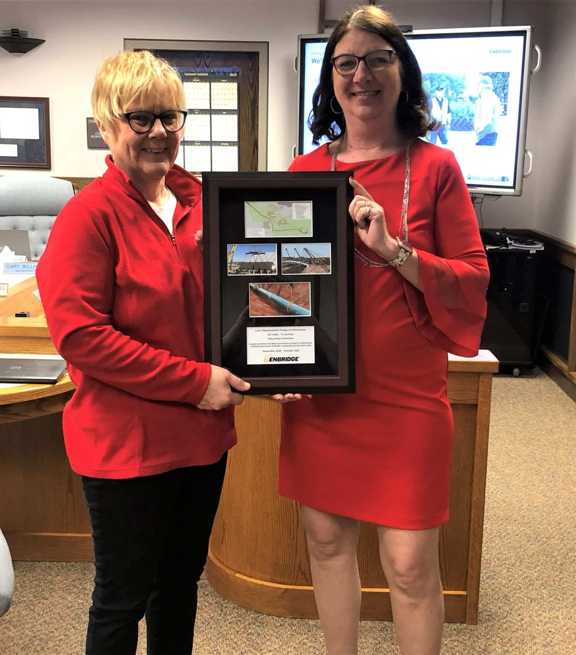 The Board then heard from Julie Huber of the multinational pipeline company Enbridge, who gave an update on the Enbridge Oil Line 3 project. She gave the Board some history of the company and that they were beginning to tamper with some greener energy sources. She explained that construction was approved and began in late 2020 with over 11,900 different workers and has now been entirely replaced with new equipment and has been operating as Line 93 since October of 2021, with over 330 miles in northern Minnesota over the last six years and has added eight new pump stations and two new pipeline maintenance shops. She reported that they have received overwhelming support from the people of Minnesota and those who live along the line. “I just came to the Board to thank them for all their support, and we truly believe that the project would not have taken place without the support that we received from the Counties, cities, and townships all along the route.” Julie Huber explained, “We just wanted an opportunity to thank them for everything they’ve done to make this project a reality.” She did so by presenting the Board with a plaque for their support in the project, which can be seen down below.