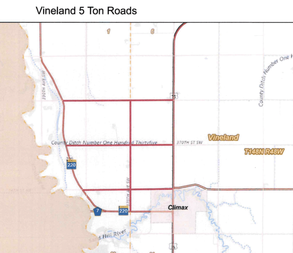 Sanders said he has received word from Vineland Township that people have been using their township roads instead of the detour and causing problems. The township requested that MnDOT install five-ton weight limit signs on some of its roadways. Polk County will include the township roads on the 2025-26 Road Restriction Map. (See picture at the bottom of the page)