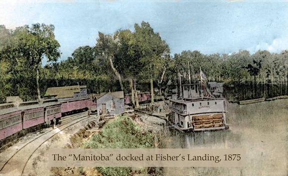 The story is long, but suffice to say that from 1875 – 1879, Fisher’s Landing was the end of the railroad, and JJ Hill and Norman Kittson moved most of their steamboats there, carrying freight and passengers north to Fort Garry (Winnipeg) and mostly furs back to The Landing, to be sent by rail to St. Paul. The rails that built the first railroad in Manitoba were hauled through The Landing, and the first locomotive, The Countess of Dufferin, along with a coal tender and flat cars, were loaded on barges at Fisher’s and towed to Fort Garry by the steamboat Selkirk.