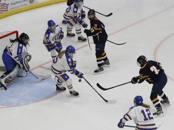 Both teams knew it was important to get an early lead. It was Thief River Falls that got it with some nice stickhandling and moves by Bella Amiot who came into the Crookston zone, turned around a Crookston defenseman walked in the slot, and let a low on the ice shot that beat Crookston goalie Kailee Magsam and a minute and a half into the game, the Prowlers were up 1-0. “We were so worried about Shelby Breiland that we didn’t pick her up, and she made some nice moves, and they got the early lead,” said Pirate head coach Tim Moe. “The play actually started at their blue line, and we had a chance to pinch in but didn’t get the puck.” Crookston would answer with two goals, just short of two minutes apart, to take what would be their only lead of the game. The first one was a Mackenzie Epema shot from the point that Prowler goalie Gabriella Steele made the save on, but Aleah Bienek was in the right spot to pop it past Steele to tie the game. “That’s what we wanted to do, get in those dirty spots for rebounds,” said Moe. “Aleah is a tough physical player that can get in those spots.” Crookston would take the lead a couple of minutes later when sophomore Grace Fischer jumped on a rebound that went off Steele to her left side. Fischer got it to the left of the goal and almost at the red line when she wristed a shot that beat Steele to her short side for a terrifically place shot and goal and the Pirates led 2-1, and they were excited. “It’s nice to see that third line get some opportunities like that, and Grace did a very nice job of getting to the puck and placing her shot on goal from where she was. It was a huge lift for us at that point,” said Moe. That feeling lasted 11 seconds when the Prowlers off the draw had Shelby Breiland winning the face-off over to Janae Johnson, who was into the Crookston zone and in the circle to the left of Magsam took a shot that snuck by the Pirate netminder and any momentum the Pirates had was taken away by Johnson’s goal and it was 2-2. “Overall, we felt good going into the first-period break with the tie,” said Moe. “We played some good hockey in the period and looked forward to keeping it going in the second.”