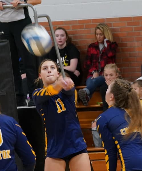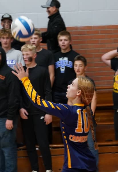 The start of the second set featured runs with Crookston pulling in front 6-1. The run was highlighted with back-to-back aces from Lorelai Hebert. RLCC would counter with a run of their own scoring seven of the next nine to tie the set at 8-8 and force a Pirates timeout. Crookston would regather themselves after three more points from the Mustangs, and go on another run to tie things back up at 13-13. The two teams would trade point after point from there until it was 16-15 Mustangs. The Pirates would capitalize on a couple of RLCC violations and score three straight to pull in front 18-16 forcing an RLCC timeout. RLCC would once again tie the match at 19-19 and it would be a race to six points. After the teams traded points, Crookston would pull in front with two straight points capped off by a McKenzie Funk kill, giving them a 22-20 edge. The Mustangs weren’t rattled and would score four straight of their own to give themselves a set point in front 24-22. Crookston would fight off a set point on a Libby Salentine kill, but the Mustangs would win the set on the next point 25-23 to go in front 2-0 with a chance to win the match in the third set.