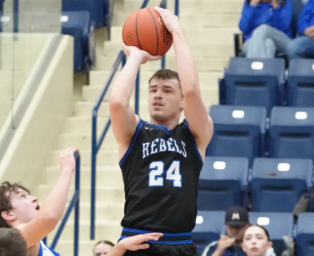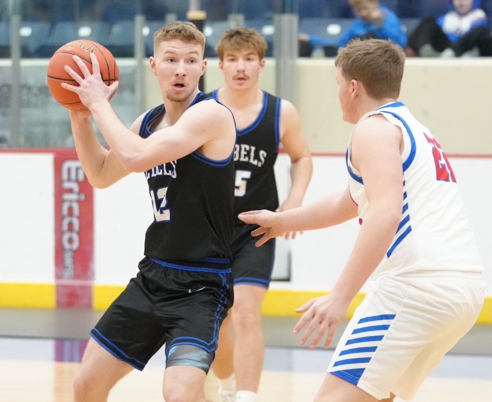 The game had one tie and eight lead changes in the first five minutes of the game. The eighth lead change came on a Connor Duden three-pointer for a 14-12 lead before Ben Gullingsrud followed with a three-pointer over a minute later. Duden added another basket to cap an 8-0 run for a 19-12 lead with 10:34 left in the half. Win-E-Mac stopped the run with a basket before Red Lake County’s Ethan Johnson made two free throws and Duden made an NBA three-pointer for a 24-14 lead. Red Lake County led 26-16 when Win-E-Mac went on an 8-4 run after a pair of Joe Courneya three-pointers, and the Rebel lead was cut down to 30-24 with five minutes left in the half. It was at this point of the game that Red Lake County’s Nick Suchy put on a shooting clinic. Suchy made three straight three-pointers in 55 seconds for a 39-24 lead. After a Patriot basket, Suchy buried another three-pointer, which was followed by a long three-pointer by Duden for a 45-26 lead. After a Win-E-Mac basket, Thor Thompson made two free throws, followed by a Ben Gullingsrud three-pointer. Win-E-Mac made a basket, and Red Lake County’s Suchy let a shot fly from about 35 feet out and banked it in at the buzzer to give the Rebels a 53-30 lead going into halftime.