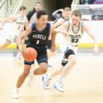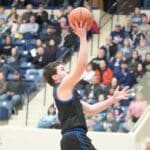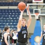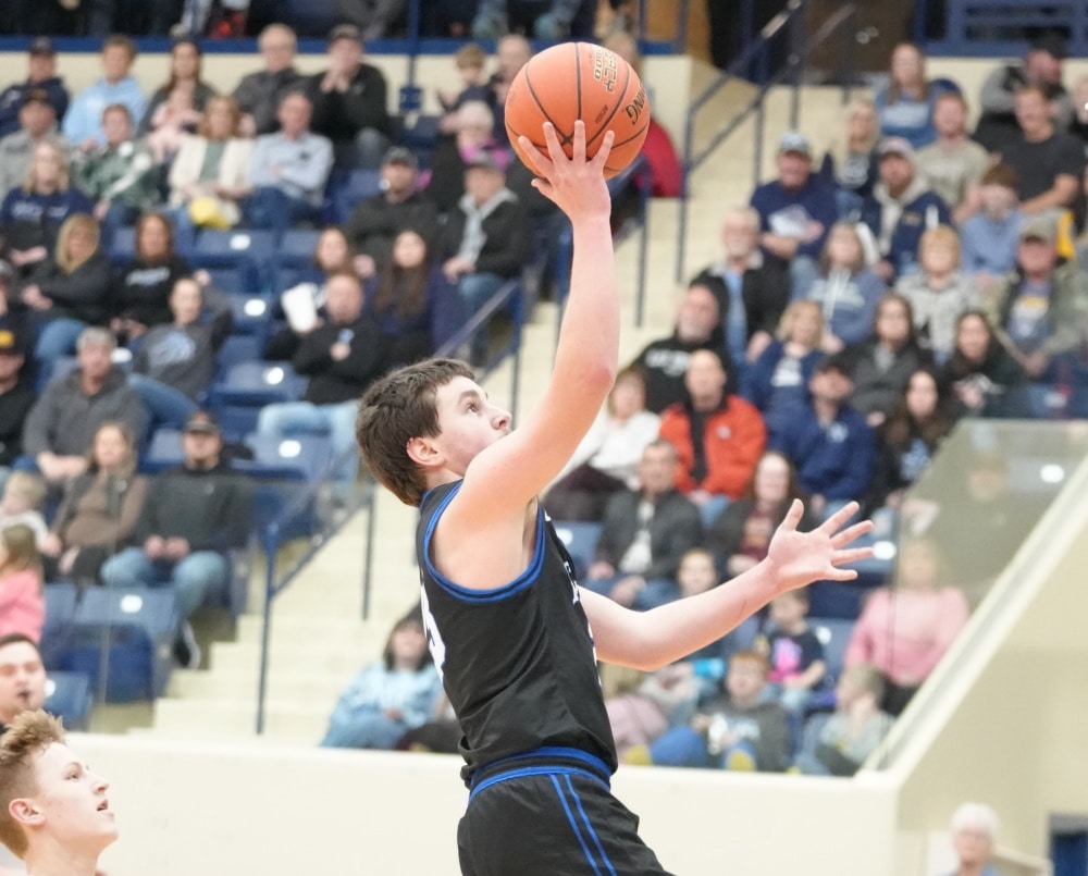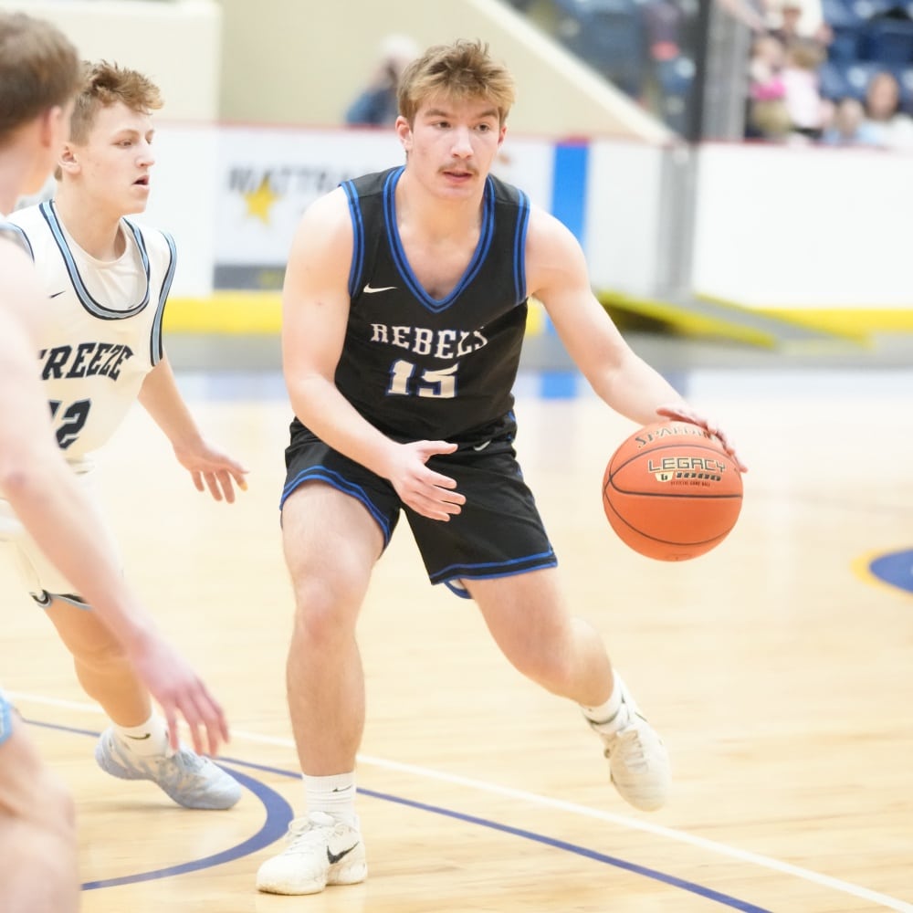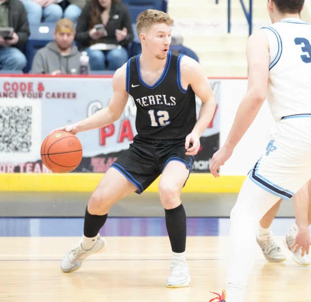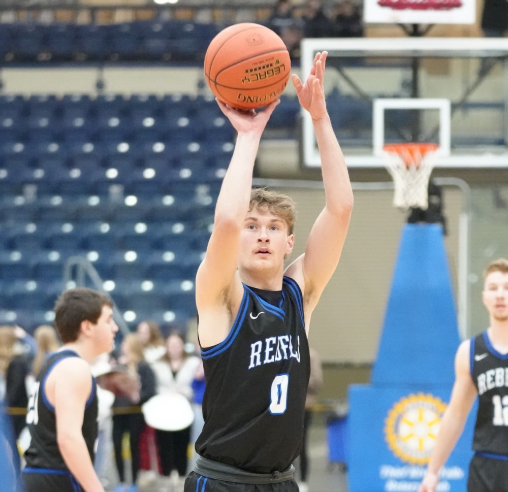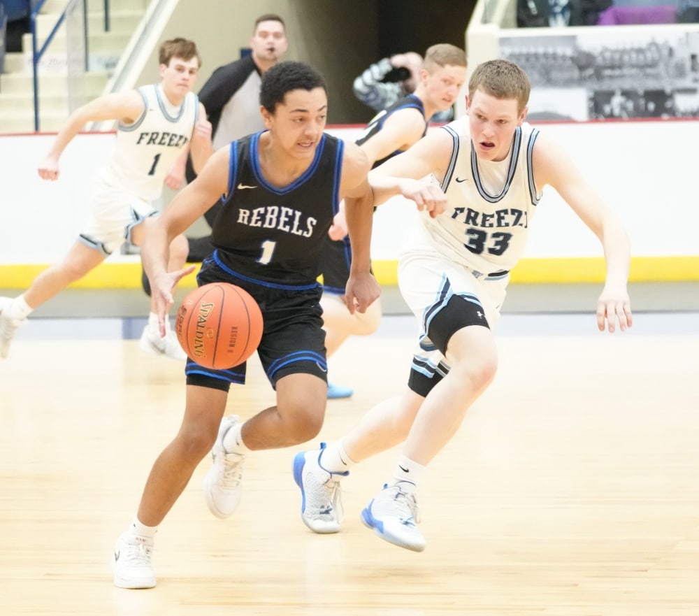 Both the Freeze and the Rebels came out of the gate hitting shots, leading to a fairly high-scoring half for the first eight minutes. The Rebels got off to a quick 8-3 lead with the help of yet another Nick Suchy three-pointer after he set the school record with nine of them in the game on Saturday. However, the Freeze bit back, feeding the ball inside to 6’4 center Avynn Ryba, who hit a finesse layup to cut the lead to 8-7. The teams then exchanged buckets for the next few minutes, with the Freeze getting the lead down to one on multiple occasions, but were unable to tie. At 19-16 Rebels, a runner by Connor Duden brought the lead to five, and then after a bucket from the Freeze’s Trig Anderson, Ben Gullingrud drilled a three-pointer to give the Rebels their largest lead to this point, at 24-18. The Freeze had another answer, as Brekken Bring responded with a deep one to make it 24-21 with six minutes to go. The Rebels answered with a 10-0 run with Duden making a basket and a pair of three-pointers, and Gullingsrud added a basket for a 34-21 lead. The Freeze responded with three points to get within a 34-24 deficit with 1:29 left in the half, but a layup by Alex Renner gave the Rebels a 36-24 lead at the break.