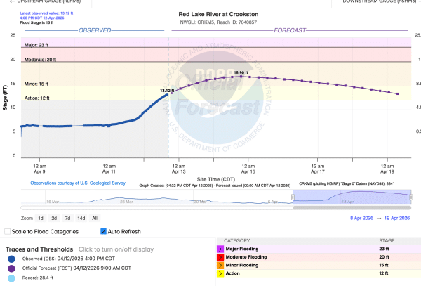 The Red Lake River in Crookston is continuing to rise and is currently forecasted to crest on Tuesday, April 14.