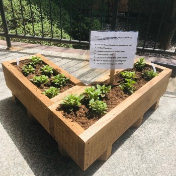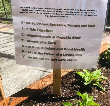 COVID-19 Victory Gardens are a growing trend since the start of the pandemic. Victory Gardens also called war gardens or food gardens for defense; were a vegetable, fruit, and herb gardens planted at private residences and public parks in the United States, United Kingdom, Canada, Australia, and Germany during World War I and World War II to help prevent food shortage. The SUMMIT tenants opted to plant some beautiful flowers in the planter instead. The SUMMIT COVID-19 Victory Garden was inspired by an idea from Sister Barbara Kaufmann, a SUMMIT tenant, who is pictured planting the flowers. Gary Garcia built and donated the beautiful planter.  This Victory Garden brings beauty, hope, and inspiration during these uncertain times.