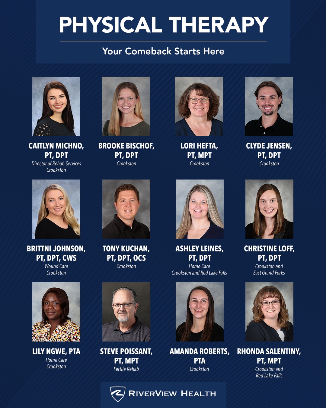 If you’re having issues with your ability to move and function in your daily life, talk to your primary care provider about services offered by RiverView’s PT Team or call Rehab Services at 218-281-9463 for more information.