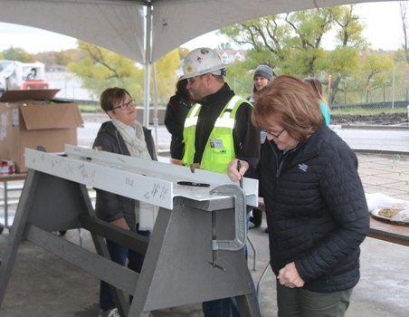 A large structure such as the hospital requires large quantities of steel, class five gravel, bolts, and concrete.  Toso said about 445 tons of steel were needed for the structure and noted many of the other large numbers associated with the project. “The structure here is about 445 tons of iron set in place with the heaviest piece being about 3,800 lbs. which is the size of a small car,” said Toso.  “It took about 8,200 bolts to put it all together.  So, big numbers when we’re looking at it.  Sometimes it doesn’t look like much, but there are a lot of little pieces that go into it.  We excavated 8,500 yards of clay.  We haul in 19,000 tons of class five to build up the interior to the plans and specs.  And we hauled off about 4,500 tons of concrete and general demo debris taking the old building out of here.  A lot has gone in [to the structure], and we’re still putting in.  To date, we’ve about 2,700 cubic yards of cementitious fill with that being CDF fill, concrete foundations, concrete slabs, slabs on the deck, and we’re still moving forward with that. A lot of great work done by the local trade partners and everybody here in the community.”