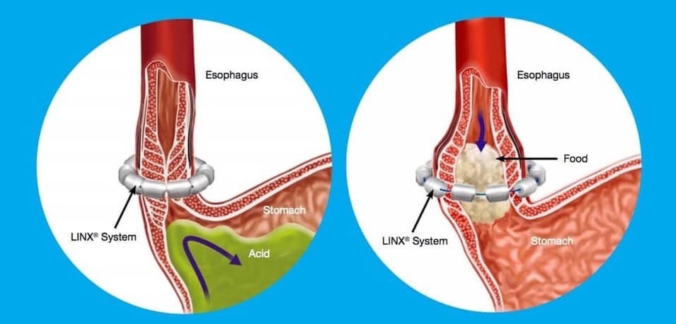 LINX® is a medical device implanted during a minimally invasive surgical procedure using small incisions. LINX® uses a small, flexible band of beads designed to help keep the sphincter closed and stop reflux. The beads in the band each have a magnet inside. When looped around the exterior of the esophagus, the magnetic attraction between the beads helps the sphincter remain closed enough to prevent reflux. However, swallowing breaks the magnetic bond, so food and liquids can pass as usual to the stomach. The band can also be removed without damage to the esophagus.