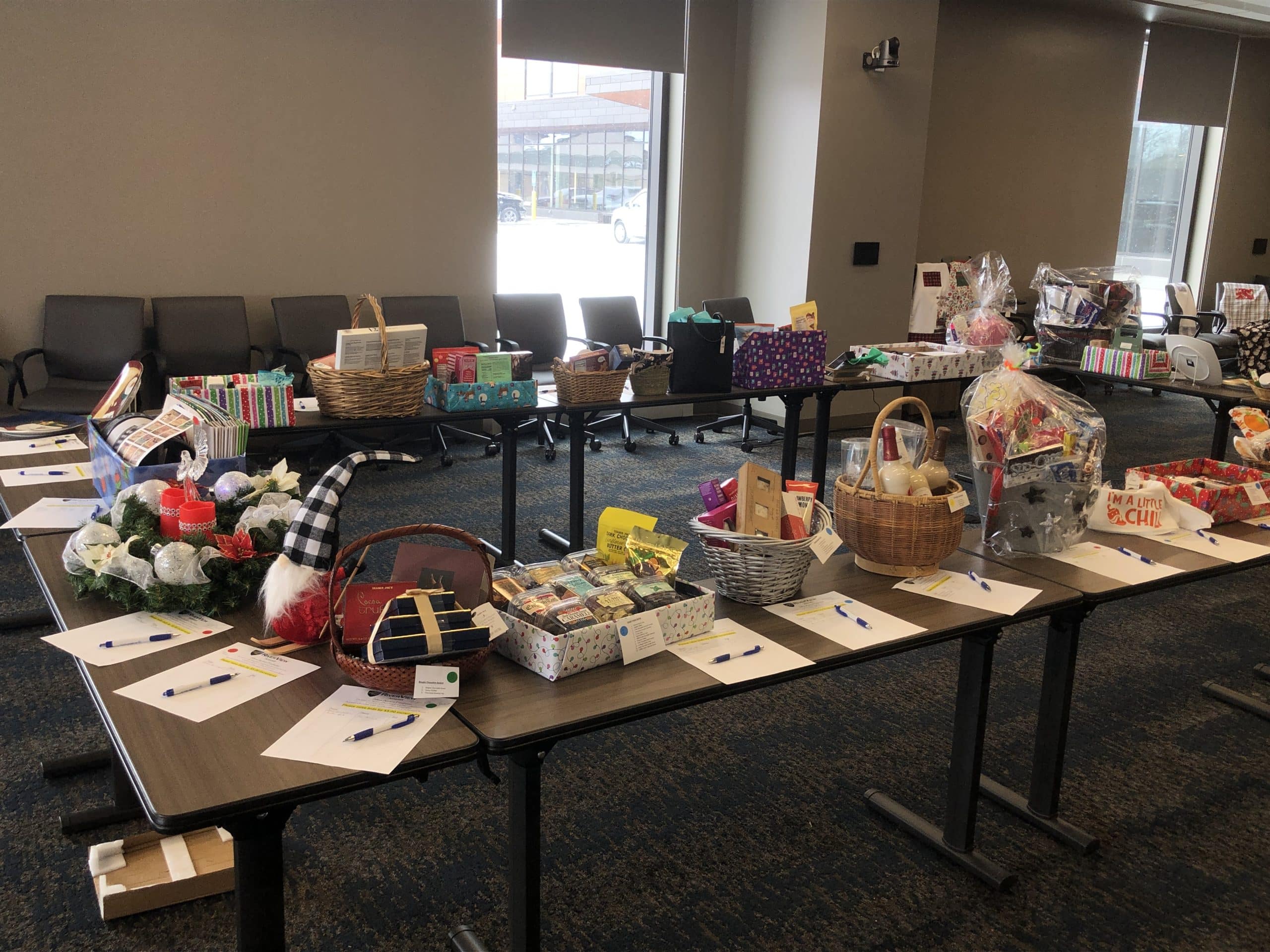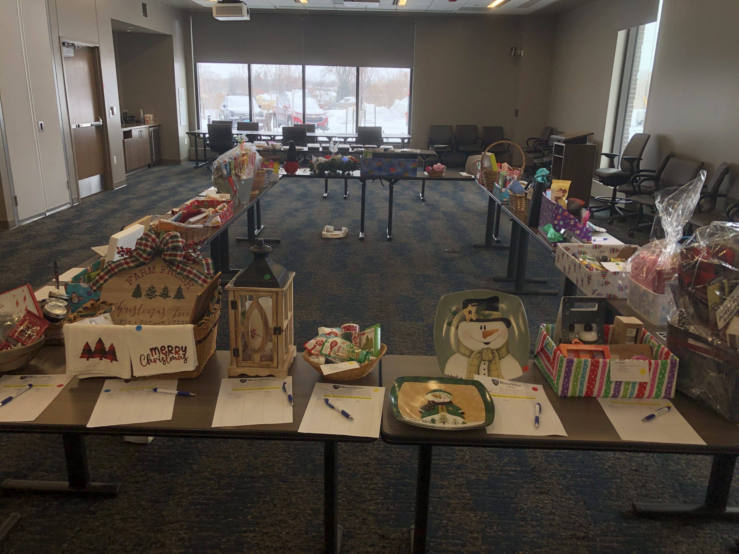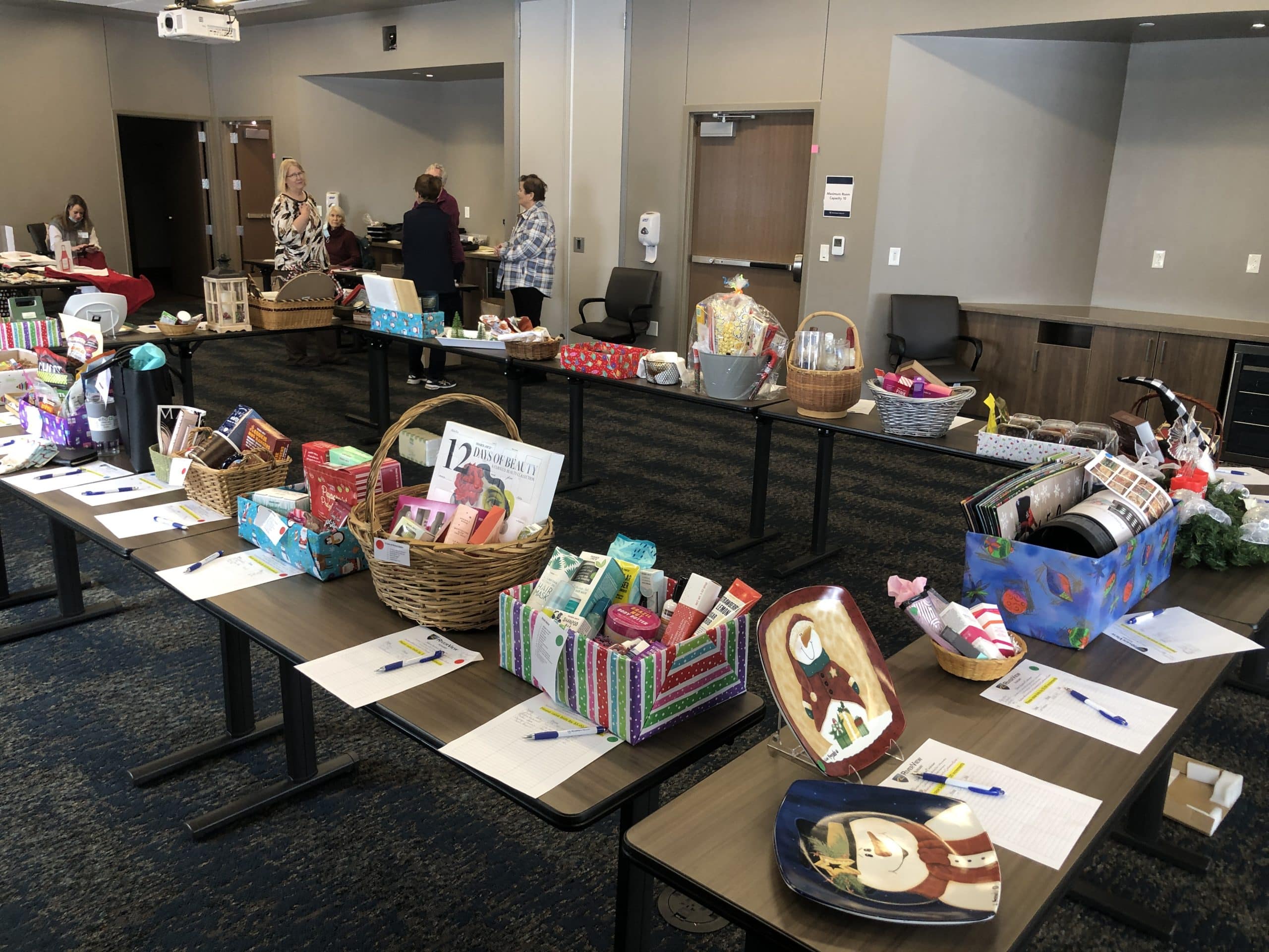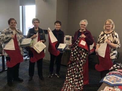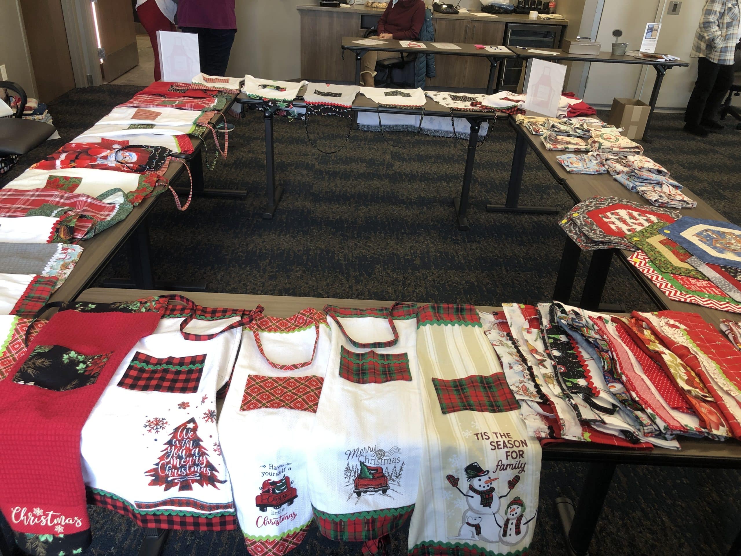 The Sewing Club has made much more than stockings this year for the holiday season. It has created many other items as a part of a fundraiser for the RiverView Health Auxiliary to go towards items and equipment requested by different departments. “We put out a call for grants that different departments can apply for, and it will be for some piece of equipment that they would like to have,” Sewing Club member Nancy Capistran explained. “Then the Auxiliary raises the funds and pays for it.” Some of the items they’ve created include aprons (including Mommy and Me apron sets for $30) for $16, table toppers and placemats for $20, lap robes, and seven tide blankets for the RiverView Memory Care. Along with those items, the Auxiliary still has 32 items available to be bid on from its Cookie Walk and Silent Auction Surge that was held on Tuesday, December 6. All items in the Silent Auction and made by the Sewing Club will be available for people to bid on in the RiverView Gift Shop until Thursday, December 8, before going back into the RiverView Conference Rooms 1-3 on Friday, December 9 until 3:00 p.m. “The sale goes on until 4:00 p.m. today,” Deb Normandin explained. “After that, the Silent Auction items and aprons will go to the Gift Shop, so they can come in anytime at the Gift Shop between 9:00 a.m. and 4:00 p.m. and take a look.” If any of the aprons or other items the Sewing Club created aren’t purchased at the end of this week, they will be available for people to purchase at RiverView’s Gift Shop until Christmas.