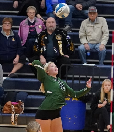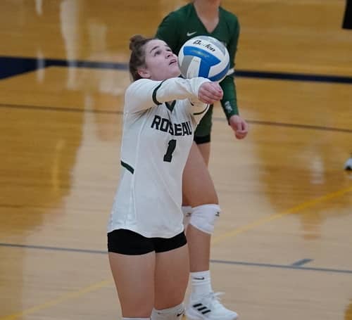 Crookston jumped out to a 4-1 lead after a Rylee Solheim ace, but Roseau answered to tie the set at 5-5 after Crookston hit into the net.  Crookston added a point before Roseau went on a 7-0 run led by two aces from Rebecca Wensloff, two kills from Anya Severson, two kills from Nevaeh Fletcher.  Crookston trailed 14-7 when they went on a 5-0 run behind a couple of Ally Perreault blocks to get within a 14-12 deficit, but Roseau would slowly pull away with a barrage of kills from four different players and a service ace on their way to a 25-19 victory to take a 1-0 lead.  “We let them go on a couple of runs and that hurt us tonight,” said Coach Englestad. “We made a run, but we couldn’t stop Roseau’s attacks.”