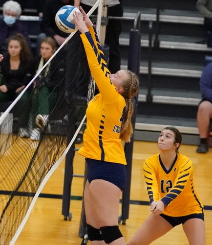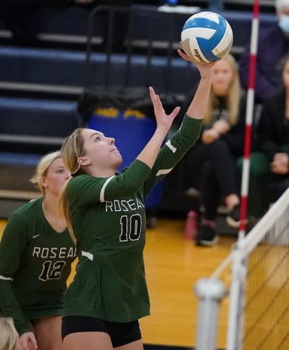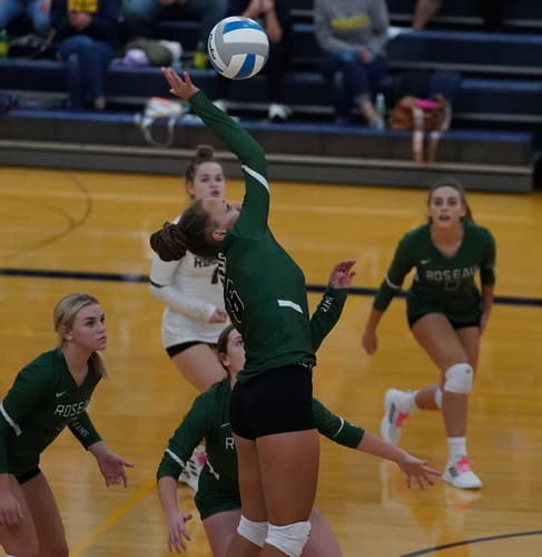 Crookston jumped out to a 4-1 lead after a Rylee Solheim ace, but Roseau answered to tie the set at 5-5 after Crookston hit into the net. Crookston added a point before Roseau went on a 7-0 run led by two aces from Rebecca Wensloff, two kills from Anya Severson, two kills from Nevaeh Fletcher. Crookston trailed 14-7 when they went on a 5-0 run behind a couple of Ally Perreault blocks to get within a 14-12 deficit, but Roseau would slowly pull away with a barrage of kills from four different players and a service ace on their way to a 25-19 victory to take a 1-0 lead. “We let them go on a couple of runs and that hurt us tonight,” said Coach Englestad. “We made a run, but we couldn’t stop Roseau’s attacks.”