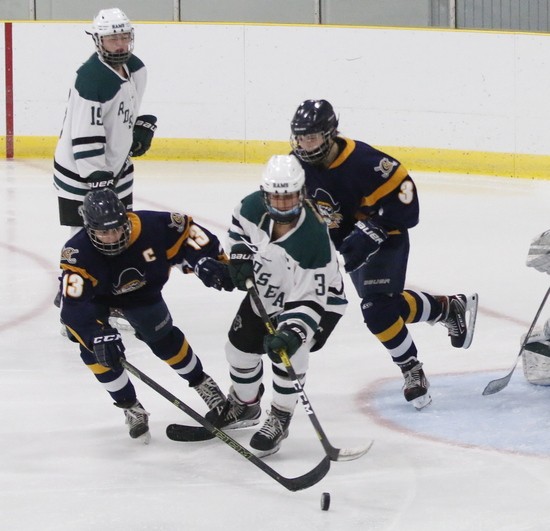 couple penalties in the period, the only three of the game thus far and the Pirates did an admiral job of killing off all the penalties with Reese Swanson and Morgan Nelson causing problems for the Rams to get to the net. Roseau did have the puck in the Crookston zone for quite a bit of time and not scoring until later, but suddenly the shots were reflection how the game was going with Roseau outshooting the Pirates 14-4 in the second period. “I think the thing is that they were just stronger than us,” said Moe, “We might have been in pretty good position and tried to use our sticks to knock the puck away and they’d go right through it. It’s like an arm tackle in football and this is what I’m going to take away the most from this game, is the strength they had.”