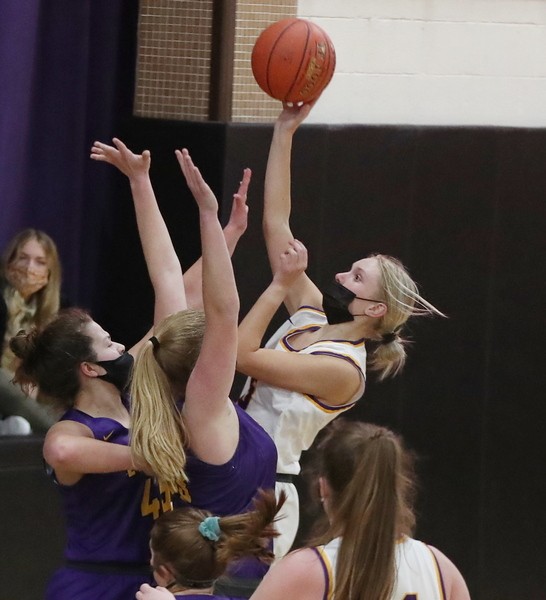 Red Lake Falls came out in the second half and slowed the game down as they ran the flex offense and worked the ball around and took time off the clock, but they weren’t able to score in the first two minutes.  Sacred Heart’s Sydney Lloyd scored the first points of the half and after a Red Lake Falls basket, she scored again and they trailed 40-18.  “I liked the pride our girls showed by coming out and playing hard in the second half,” said Sacred Heart Coach Karas. “They came out and played hard and we did some good things.”  Red Lake Falls led 47-21 halfway through the half and both teams went to the bench in the final minutes and got everybody dressed into the game.  Red Lake Falls won the game 61-29.  “We played well tonight and the last couple of games we have been moving the ball quicker and the girls are seeing the floor better,” said Red Lake Falls Coach Remick. “Our intensity was down a little bit in the second half, but we got some younger girls into the game.  We had a good week and I tell the girls every day to enjoy it and each day you step into the gym enjoy it because we are a COVID case away from not playing.”