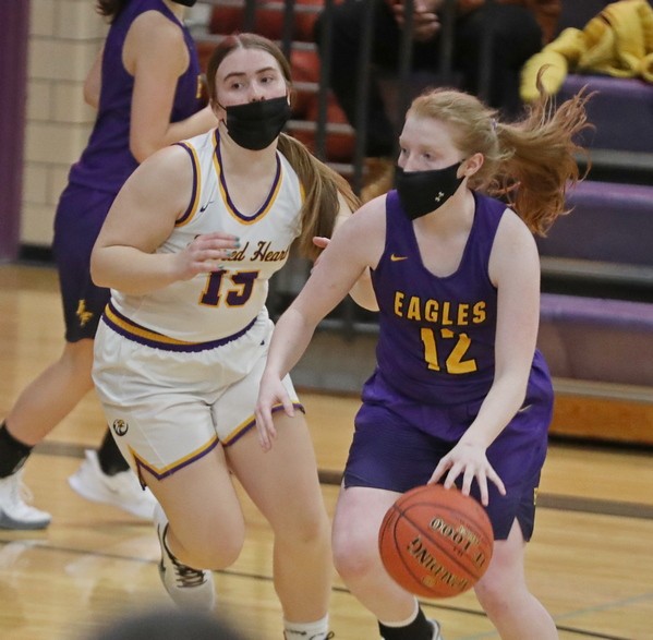 The Red Lake Falls Eagles used a 25-2 run in the first half to open up a big lead and they never looked back on their way to a 61-29 victory over the visiting Sacred Heart Eagles in a game played at the Robert Matzke Gym in Red Lake Falls.