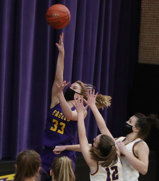 Red Lake Falls scored the first basket of the game when Maisy Hoefer scored in the paint for a 2-0 lead 90 seconds into the game.  Sacred Heart answered with a Grace Vonesh basket to tie the game.  Red Lake Falls responded with a Sienna Olson free throw and a steal and layup for Hollie Knott for a 5-2 lead.  Sacred Heart’s Vonesh scored another basket in the paint to get within a 5-4 deficit with 14:30 left in the half.  It was at this point in the game, Red Lake Falls seemed to pick up the defensive intensity and they went on a 25-2 run over the next seven-plus minutes for a 30-6 lead. “Defensively we got going and our pressure was good,” said Red Lake Falls Coach Brian Remick. “We were able to force some things and then we got out and ran a little bit and Gabby (Casavan) made a couple of threes and we really played well.” The last three Red Lake Falls baskets during the run were scored directly off steals.  “They pressured us,” said Sacred Heart Coach Blake Karaas. “They gave us fits with their defense and they had a lot of points off our turnovers.”