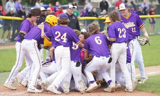 The Sacred Heart Eagles scored a walk off run on a balk in the bottom of the seventh inning with two outs to lift the Eagles to a 2-1 win over Red Lake County for the championship of Section 8A played at the Jim Karn Field in Crookston. Sacred Heart played small ball to score both runs, getting one in the fifth inning with Isaac Sundby singled, was sacrifice to second and with two outs, Elliot Arntson singled in Sundby to tie up the game at that time. Red Lake County scored in the fourth inning with Will Gieseke getting a single, the first hit of the Eagles Parker Erickson who retired the first nine batters he faced. Gieseke stole second and then went to third on a throwing error by the catcher. The next batter, Ben Gullingsrud grounded out to second base to bring in Gieseke with the first run of the game. Erickson was tough on the mound for Sacred Heart with no walks and nine strikeouts in going the distance. In the bottom of the seventh, Gullingsrud registered his eighth strikeout of the game. The Eagles Mike Gapp, batting ninth, singled and went to second on a throwing error, the Rebels second of the game, and Gapp eventually got to third on another groundout, with left it up to Josiah Sundby. With two outs and a runner on third and two strikes, Gapp started stealing home with Gullingsrud starting his windup. He was surprised by Gapp running down the line to home and threw the ball home and Gapp was tagged out and it appeared it was going extra innings, but the umpires said that Gullingsrud didn’t finish his pitching motion correctly and called the balk and that scored the run and gave Sacred Heart a win that not many baseball have seen before, a walk off run by a balk!!! You can hear what both coaches said about the balk and about the game down below.