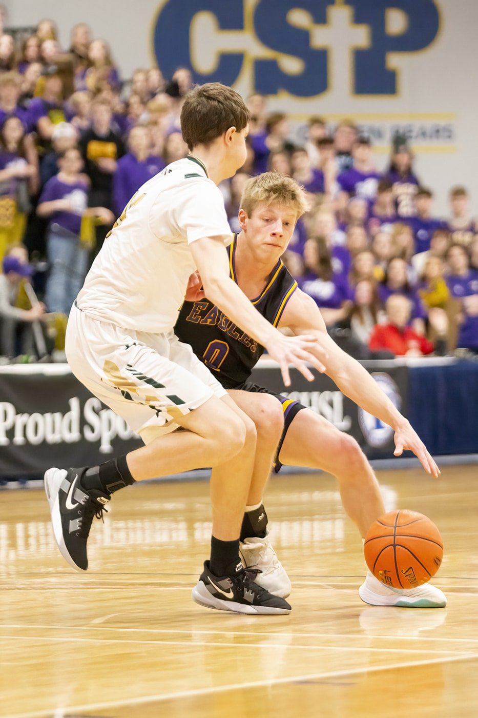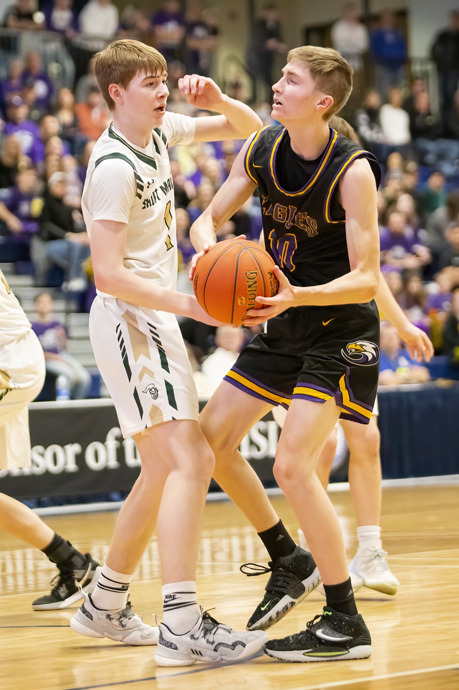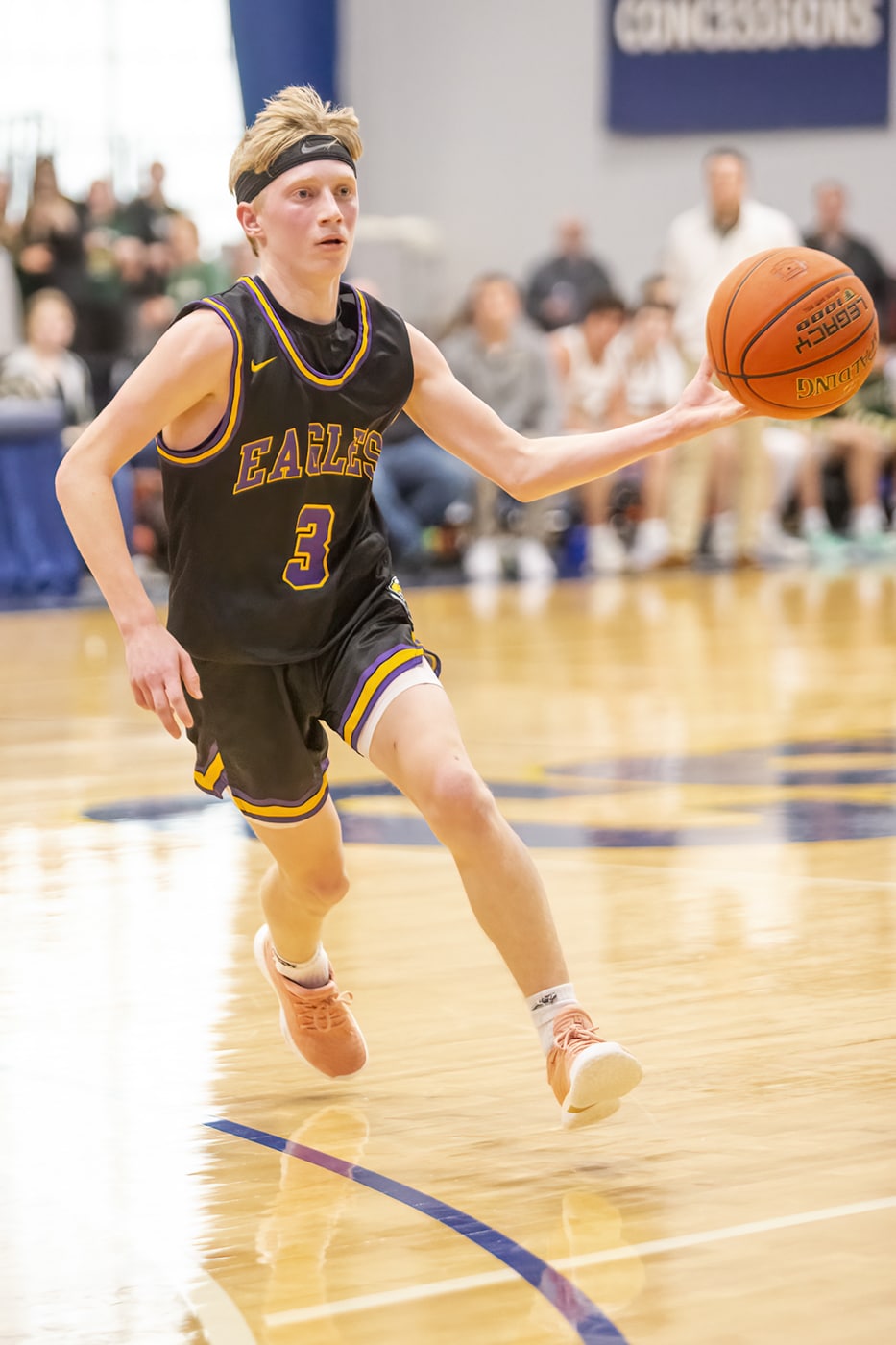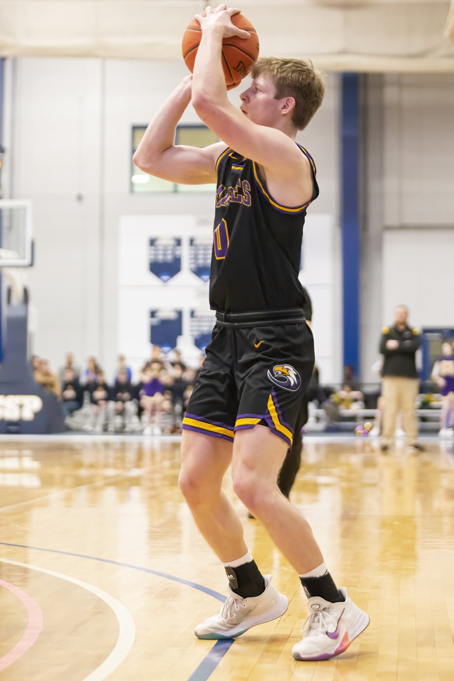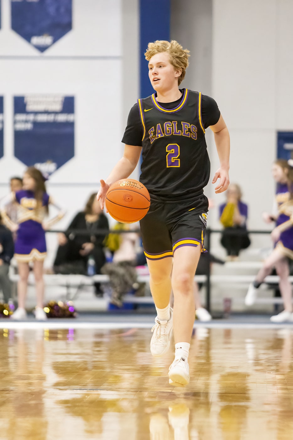 The first few minutes of the half were highlighted by lights out shooting from Sacred Heart. After a couple of baskets from Sleepy Eye St. Mary’s to take a 4-3 lead, Sacred Heart would rattle off a 12-2 run to take a 15-6 lead with 12:44 to go in the half. The run was highlighted by three-pointers from Sam Gapp, Kobe Tomkinson, Ethan Arntson, and was capped off by an and-one from Arntson. Sacred Heart would build their lead to 19-8 but, the Knights would settle in and score five of the next seven points making it 21-13 Sacred Heart. It didn’t seem to bother the Eagles, as they continued to shoot the three-pointer well, and knocked down back-to-back threes from Tomkinson and Josiah Sundby to extend the lead to 27-13. After a Sleepy Eye St. Mary’s layup, Ethan Arntson would knock down another three-pointer giving Sacred Heart their largest lead of the half at 30-15 with 5:19 until halftime. After another Knights timeout, they regrouped and changed things up defensively to slow down the Eagles. While the Eagles struggled to score, the Knights would end the first half on a 14-6 run to get back into the basketball game, only down 36-29. Sacred Heart was led by Kobe Tomkinson, Ethan Arntson, and Sam Gapp, as they combined for 33 of the team’s 36 first-half points. Josiah Sundby had the other lone three, and the Eagles shot 7-13 from three-point range in the first eighteen minutes. Sleepy Eye St. Mary’s was led by Carson Domeier with 13 first-half points and three three-pointers.