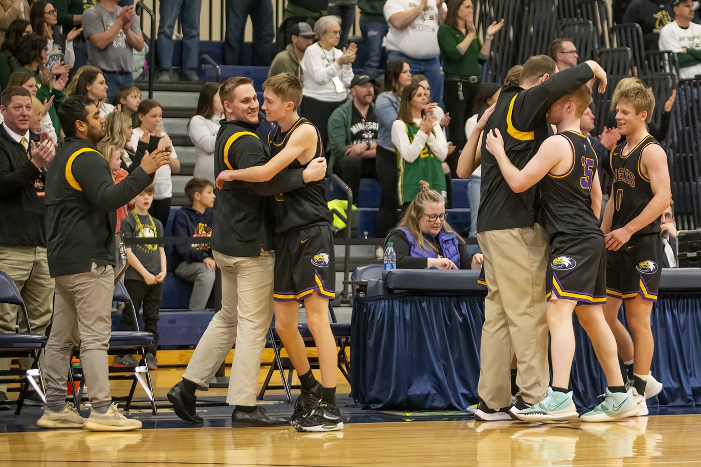 Sleepy Eye St. Mary’s would score five of the first seven points to start the second half and cut the Sacred Heart lead all the way down to four points at 38-34, the closest it had been since early in the first half. Kobe Tomkinson would continue his strong day and score four straight to extend the Eagles lead to 42-34. The teams would trade a couple of baskets from there until a 5-0 Sacred Heart scoring run would give the Eagles a comfortable lead once again at 49-38 with 10:40 remaining in the game. The Knights would continue to fight and claw back, and after a couple of scores, would be back within single digits at 51-43 with 7:41 remaining in the game. It would never get closer from there, and Sacred Heart would burst for a 7-0 scoring run capped off by a Tomkinson three giving them a 58-43 lead with just 4:51 remaining in the game. The Knights would get it back down to thirteen points, but another Tomkinson three would seal the game for good, and Sacred Heart would knock down their free throws and take control of the basketball to secure a 69-53 win. The win is the program’s first State Tournament victory ever recorded. The Eagles were led all day by Kobe Tomkinson who poured in 33 points but also got big performances from Sam Gapp, and Ethan Arntson. Those three combined for 64 of the teams 69 points, with Josiah Sundby scoring the other 5. Sacred Heart also shot 52% from the field as a team and was 10-11 at the free-throw line to help secure the win.