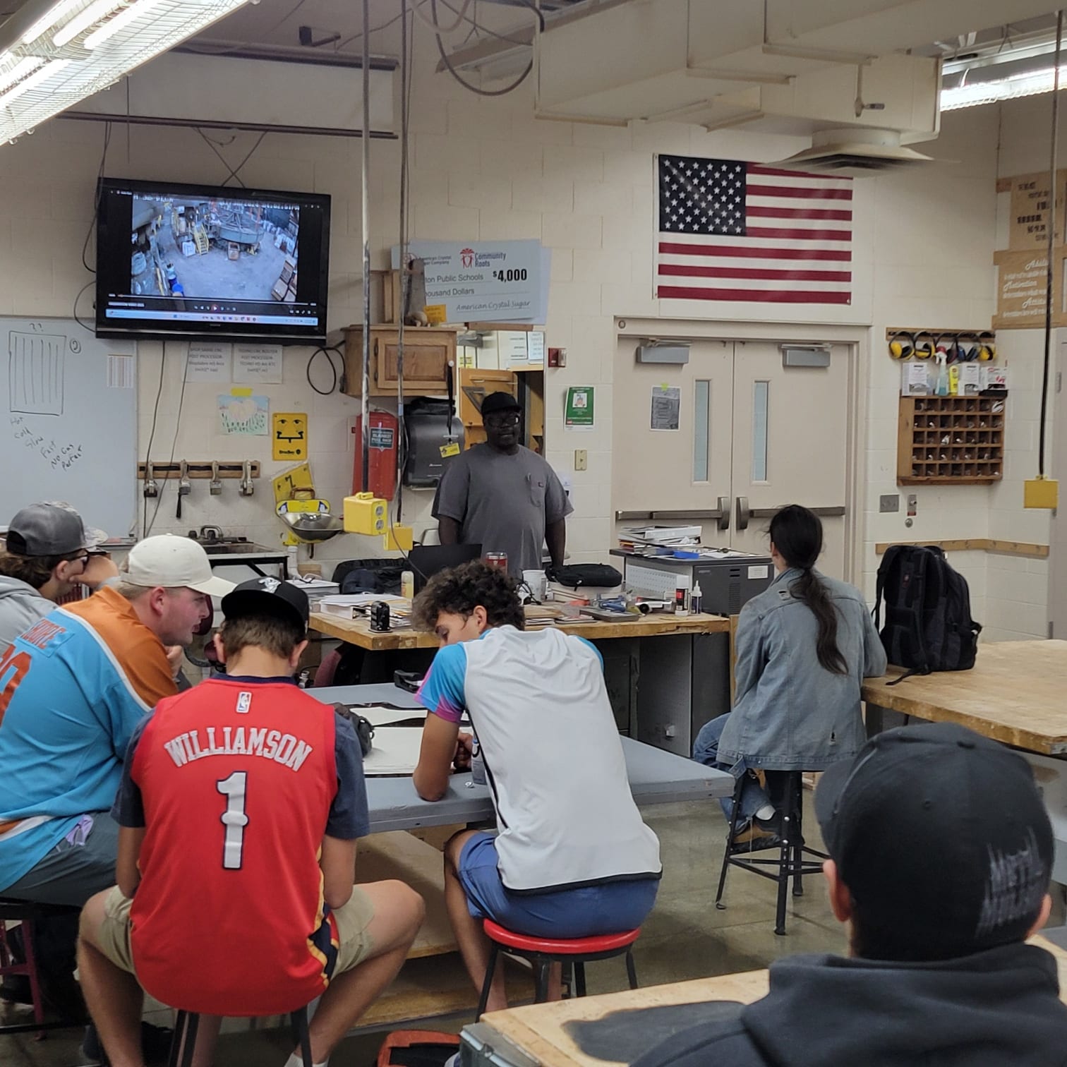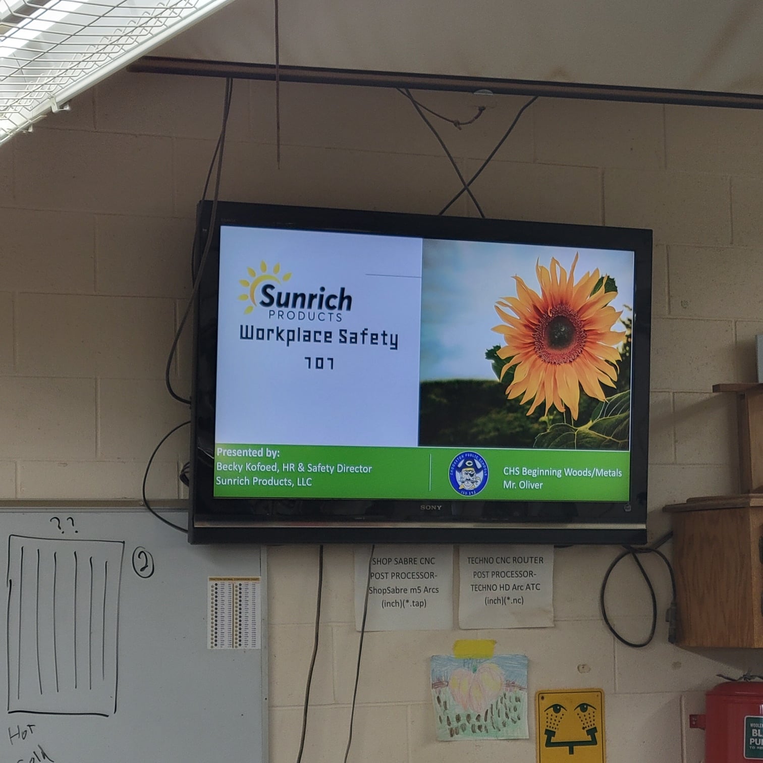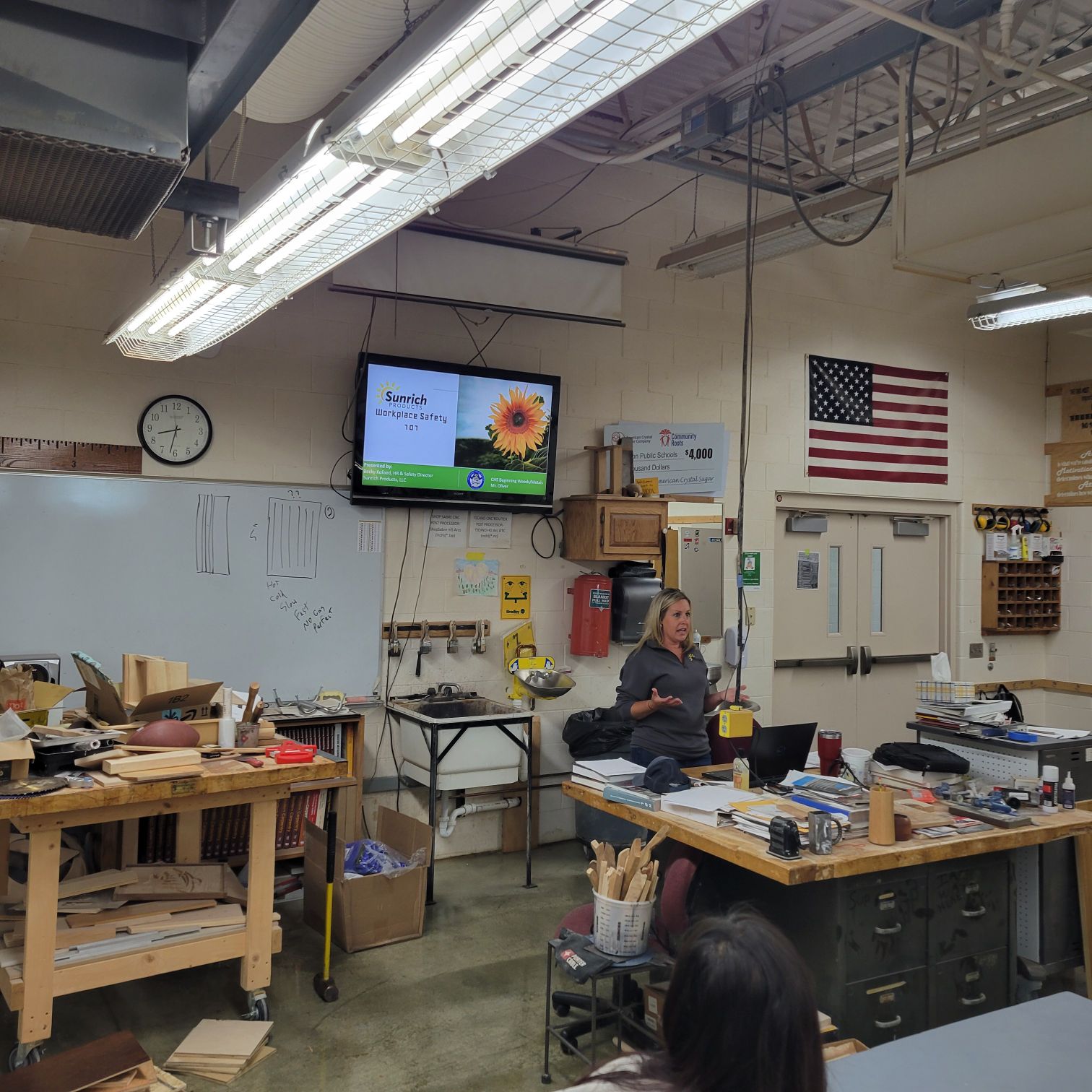 Becky Kofoed, the Director of HR and Safety from Sunrich Products, a sunflower producer in Crookston, and Charles Edwards, the Safety Coordinator from DEE Manufacturing, an aluminum foundry and machine shop in Crookston. “Kofoed and Edwards took time away from their companies to visit with my students about safety practices that they have in place at the businesses they work for. Becky visited my Intro classes in Woods and Welding (3 classes), and Charles visited my 2nd year classes in Woods and Welding (2 classes),” said Mr. Oliver. “Becky spoke about what safety looks like at Sunrich, employee safety training, workplace hazards and preventive measures, required PPE, overview of accidents, and what the process looks like if someone gets hurt on the job. Charles spoke about the hazards that exist at DEE, the common injuries, types of training employees receive, and the required PPE.”