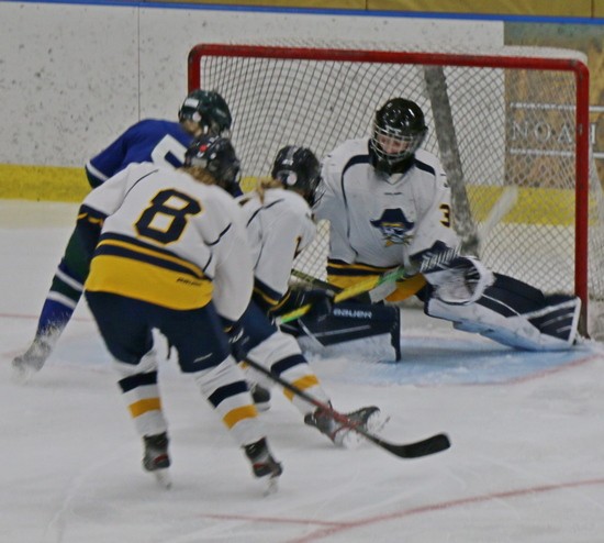 Although the Crookston Pirate Girls Hockey team dominated most of the game, it took a Jenna Seaver wrist shot from the point with 2:30 left in the game to break a 2-2 deadlock and give the Pirates an exciting 3-2 win over the West Fargo United in a game played at the Crookston Sports Center.