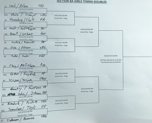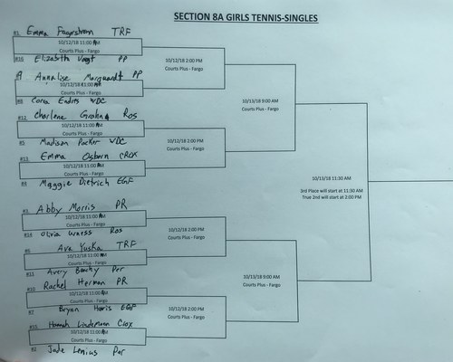 In singles, Emma Osborn received the 13th seed and will play #4 seed Maggie Dietrich of East Grand Forks in the first round. Hannah Lindemoen received the 15th seed and will play #2 Jade Lenius of Perham in the first round.