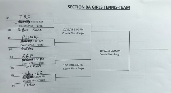 The Section 8A Girls Tennis coaches held their seeding meeting in Mahnomen on Friday and there was a fight for the third seed with Crookston and East Grand Forks. After a lengthy discussion, the coaches couldn’t decide so they flipped a coin. East Grand Forks won the coin flip and will be the third seed and Crookston the fourth. The team and individual tournament will be played at Fargo Courts Plus on Thursday, October 10 through Saturday, October 12. The team seeds are below –