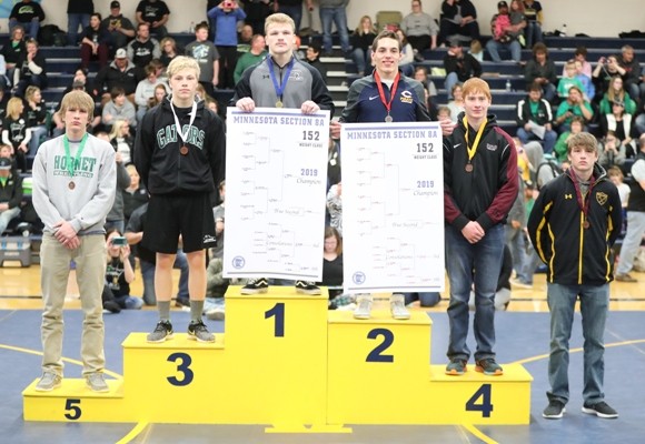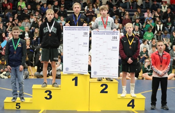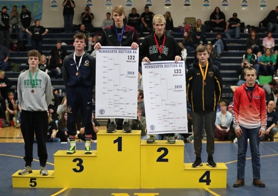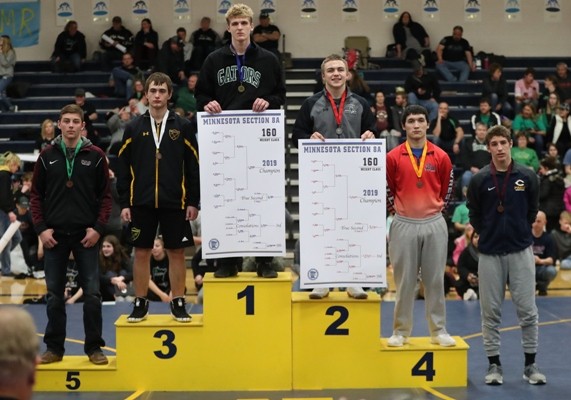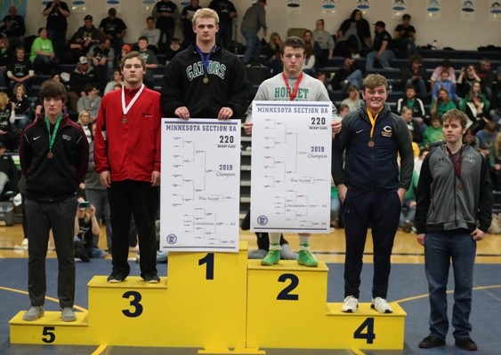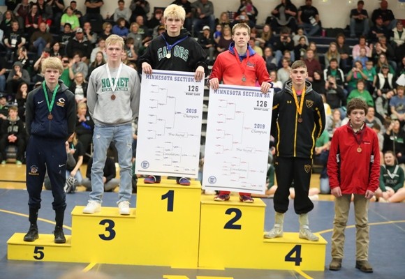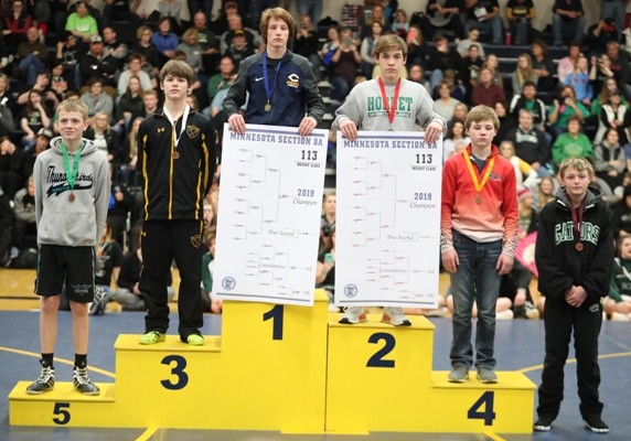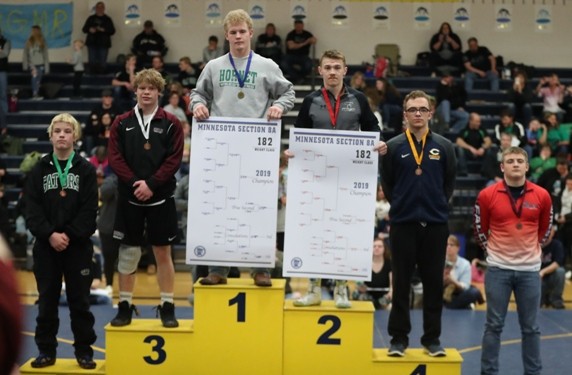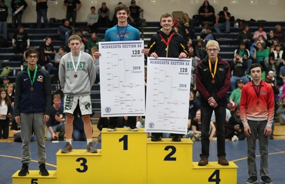 #2 ranked Zach Brown (113 pounds) wrestles Christian Carlson of Frazee in the championship.  Zach took a 2-0 lead with a takedown with 50 seconds left in the first period and towards the end of the period he was close to a pin and was awarded three points for a 5-0 lead after the first period.  Zach got a takedown with 40 seconds left in the second period and later gave up an escape for a 7-1 lead.  Right after the escape, Zach scored on a takedown for a 9-1 lead after two periods.  In the third period, Zach’s opponent scored two points on a reversal and Zach held off a furious rally by Carlson and was able to hold on for a 10-5 victory to advance back to state as the two time Section 8A Champion.  “Zach did a couple things really well. There was a series on the edge of the mat where he had an opportunity to score with an arm-bar and he was able to keep his feet in and drag him back in and he put the kid in a bad spot and got a nice tilt and picked up some near fall points to expand his lead,” said Coach Hanson. “We saw a lot of good things from Zach this weekend.” Zach is now 38-1 on the year and will compete at the Minnesota State High School League State Individual Wrestling tournament on Friday, March 1 and Saturday, March 2.