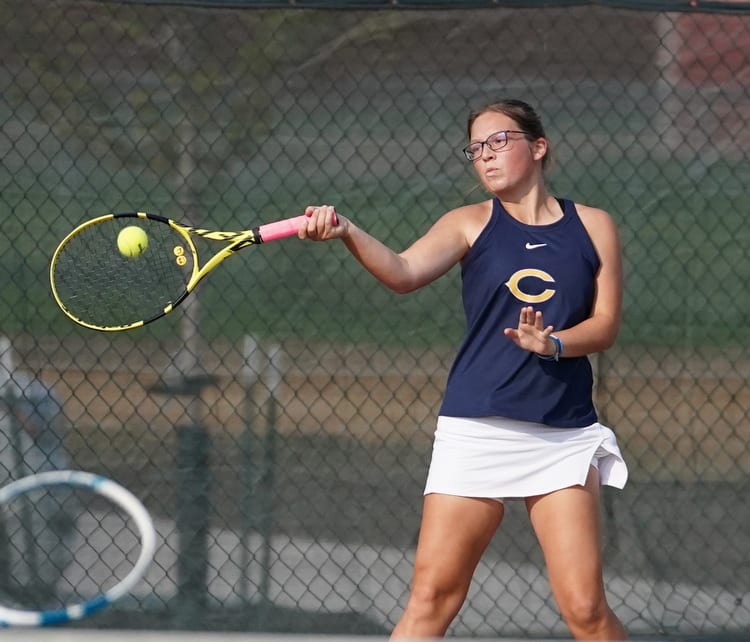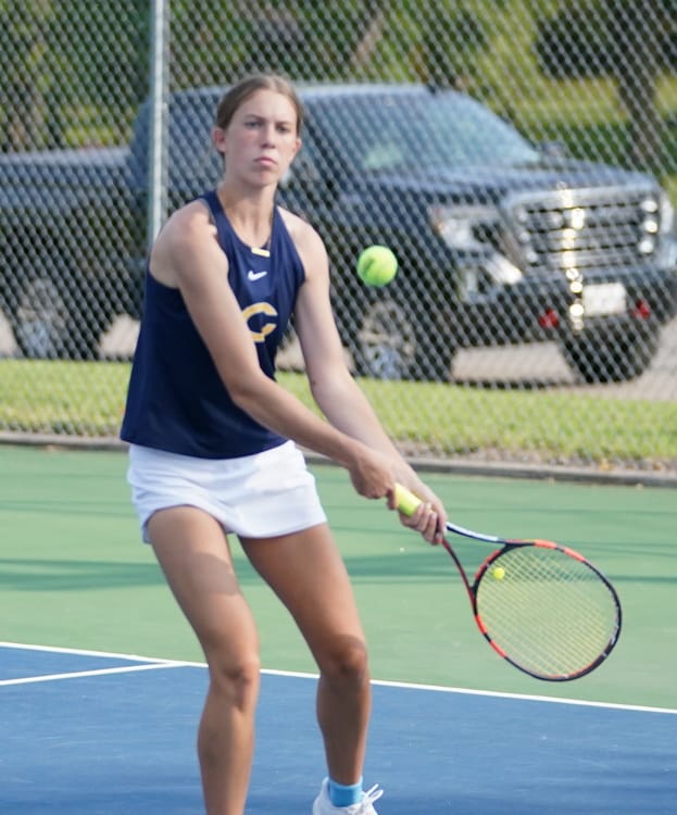 Isabelle Smith won a hard-fought 7-6 first set before cruising to a 6-1 win in the second set to get a victory at third singles. “She came back and finished it off nicely,” said Coach Tiedemann.