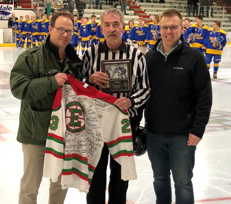 East Grand Forks Green Wave hockey thanked longtime hockey official, George Weber, at their game on Tuesday evening with an autographed Green Wave jersey. George is one of the better hockey officials in the area and is a class act. Congrats to George on his upcoming retirement and he will be missed after his 40-plus years of officiating.