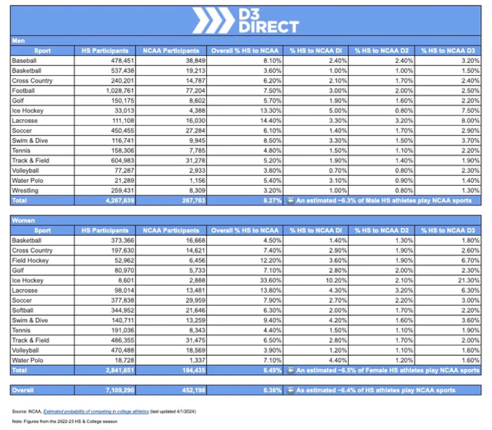 The latest numbers are out, and they just go to show you that playing college sports is a privilege in the NCAA. The numbers speak for themselves: An estimated 6.3 percent of high school male athletes play NCAA (D1, D2, D3) sports, and an estimated 6.5 percent of women play NCAA sports in college. All numbers are from the NCAA.