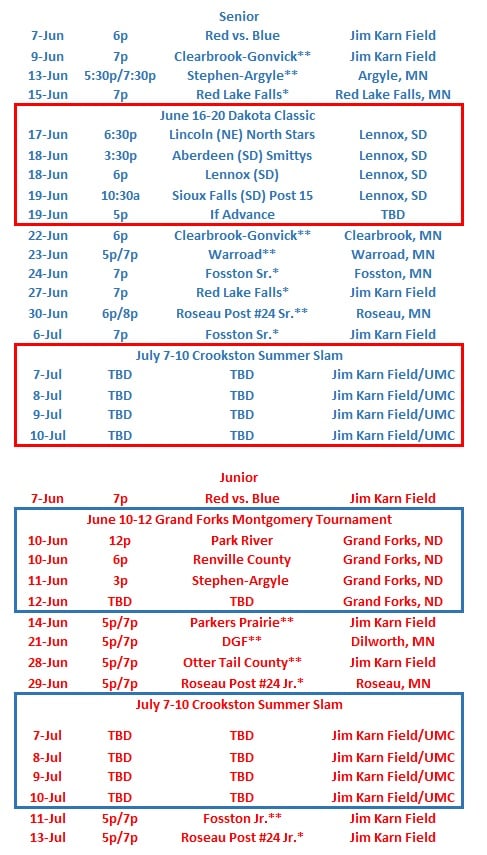 The Crookston American Legion and Junior American Legion schedules have been released and updated already. The schedules for both teams are below –