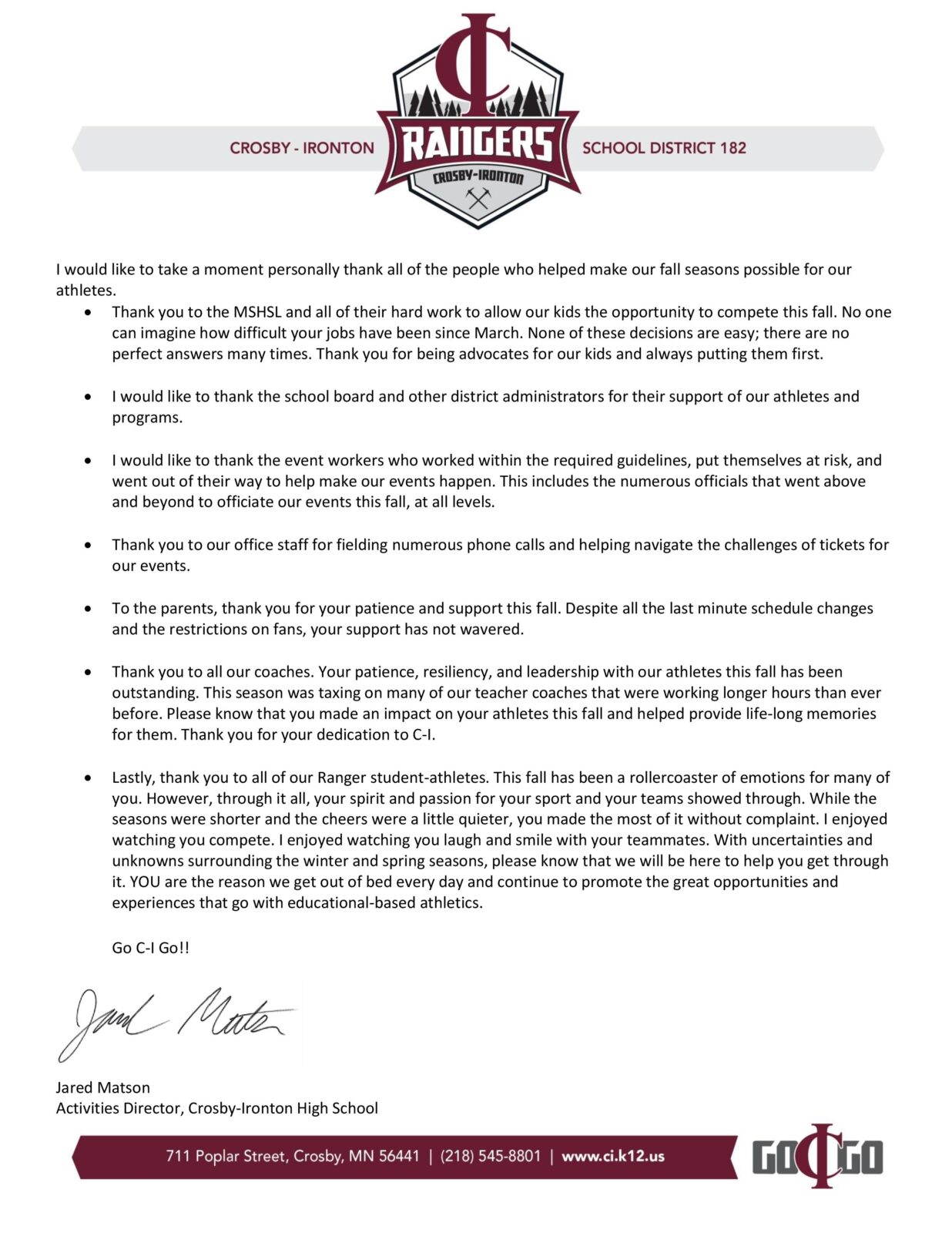 I thought Crosby-Ironton Rangers Activities Director Jared Matson had a great letter he sent out. The letter is below –