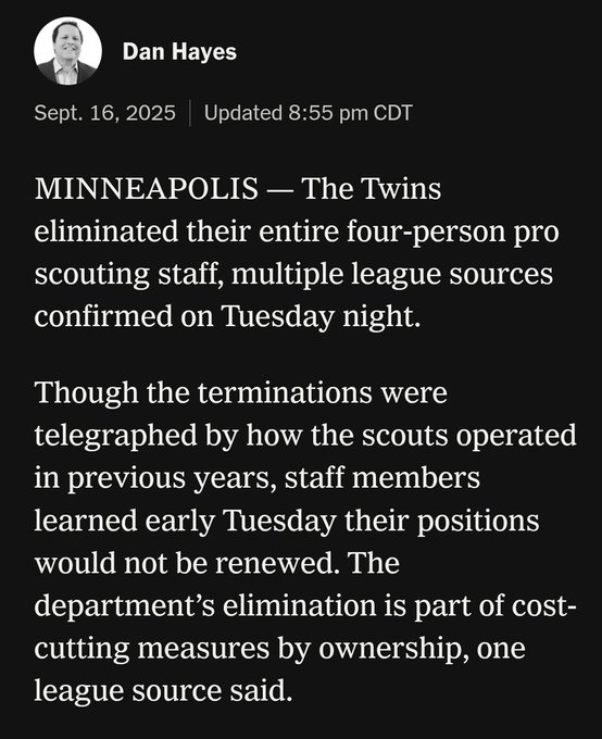 Speaking of sucking……The Minnesota Twins ownership cut their four-person pro scouting department. What else can the Pohlad’s do to ruin the Twins????