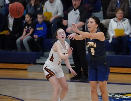 The Stephen-Argyle Storm Girl’s Basketball team hosted the Lake of the Woods Bears on Thursday night in a Section 8A Tournament game played in Argyle. Stephen-Argyle was playing in the game as the top seed in the West Sub-Section, while Lake of the Woods earned the #8 seed in the West Sub-Section and defeated the #9 seed in the West Sub-Section Climax-Fisher 54-48 in a play in the game on Tuesday night given them this opportunity. While Lake of the Woods started the game strong, Stephen-Argyle woke up and used an 18-0 run to end the first half to help cruise to a 72-29 victory. “We started slow, and credit to Lake of the Woods for the way they played us early,” said Stephen-Argyle Head Coach Heidi Carlson. “We did get it rolling and picked up the intensity, but we will need to make sure we are ready to go right from the start moving forward if we want to keep winning.”