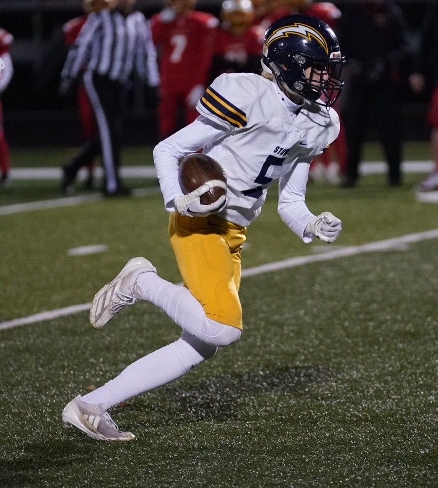 Stephen-Argyle started the ensuing drive at their own 32 yard line. The first play was an 11 yard run by Smith for a first down. Setterholm found Caden Pagnac for a four yard pass, but he had his helmet ripped off and a 15-yard facemask penalty was called for a 19 yard gain and another first down. MIB was penalized five more yards on the next play before a 17 yard pass to Benitt for another first down. Smith ran for six yards, Setterholm for two yards, but the next play was a loss of one setting up a fourth down and three situation. The pass was incomplete and the Storm turned the ball over on downs at the MIB 13 yard line.