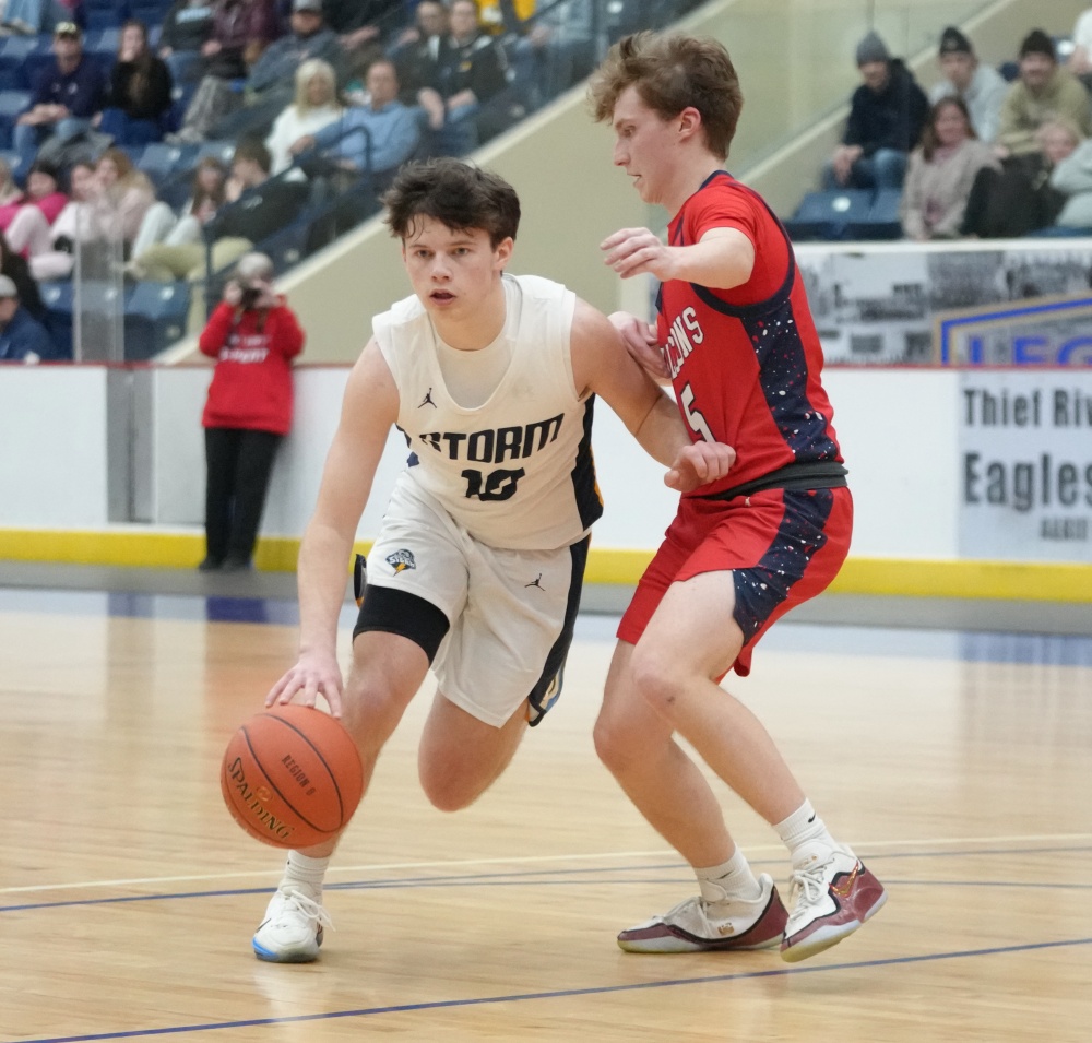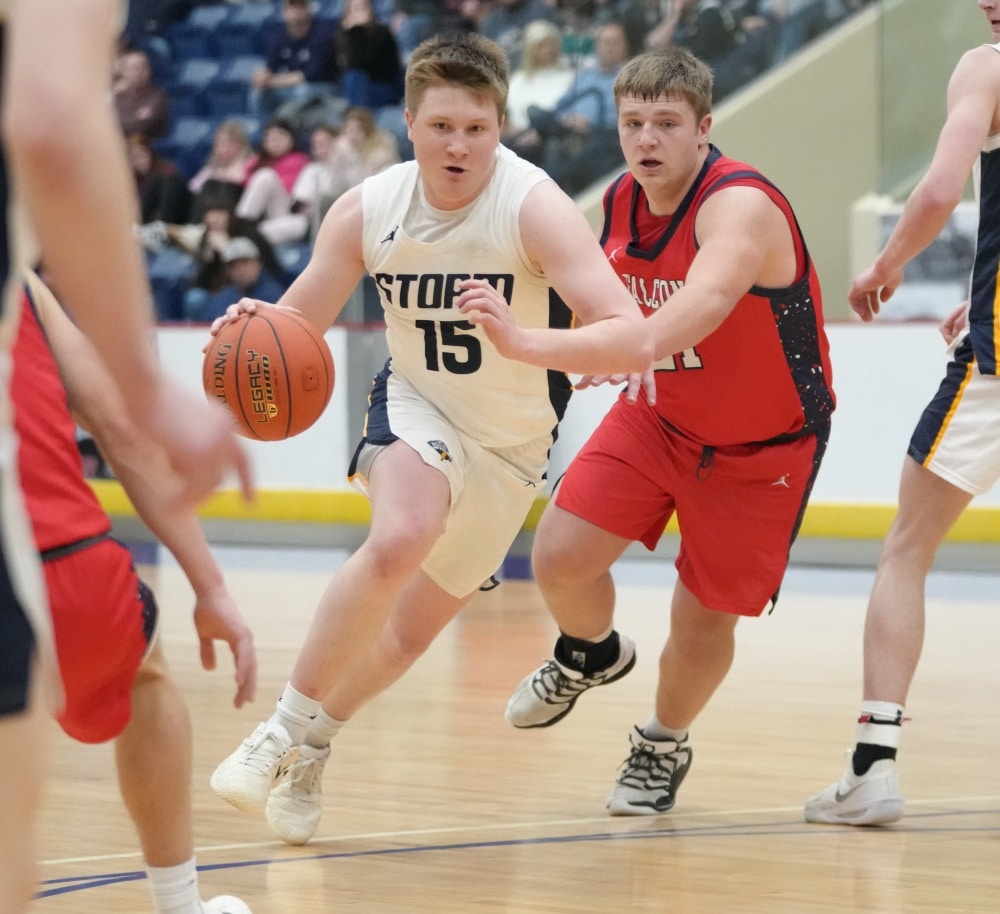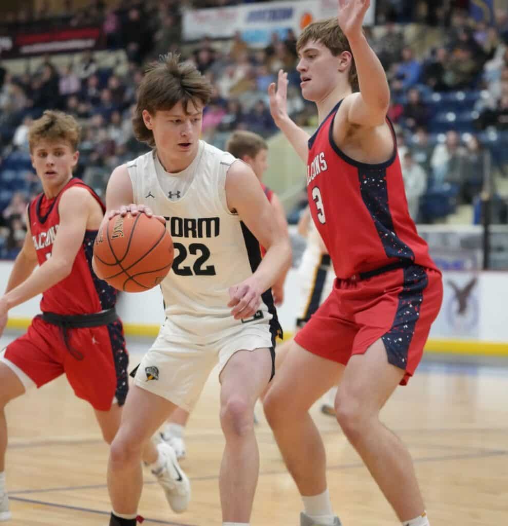 Stephen-Argyle got off to a good start by scoring the first six points of the game with baskets from Caden Pagnac, Jake Carlson, and Rayden Woinarowicz for a 6-0 lead. Fertile-Beltrami’s first points came a little over two minutes into the game when Bryer Strem scored, followed by a bucket from Steven Sather to spark a 10-4 run with a Strem steal and two free throws, and back-to-back baskets from Caleb Sather to tie the game at 10-10 six minutes into the half. The teams exchanged baskets for a tie at 12 before Stephen-Argyle’s Dylan Widner buried a three-pointer and Raydon Woinarowicz added a basket for a 17-12 lead. With 9:51 left in the half, Stephen-Argyle was called for a technical foul for having six players on the court after a timeout. Fertile-Beltrami’s Strem made one free throw and on the same possession the Falcons Gullickson made a basket to bring the Falcon’s within a 17-15 deficit halfway through the half. Stephen-Argyle responded with a 10-2 run with Anders Thompson starting the run with a basket, Pagnac added a basket and after a made Storm free throw, Shay Setterholm made a three-pointer and followed with a reverse layup for a 27-15 lead with 4:20 left in the half. Fertile-Beltrami picked up its defense and didn’t allow a Storm point in the final four minutes and they had a Strem basket followed by a Caleb Sather three-pointer and Stephen-Argyle took a 27-20 lead into halftime.