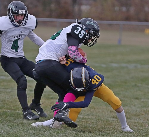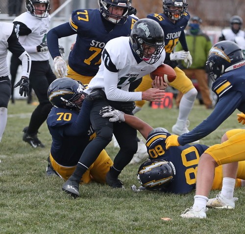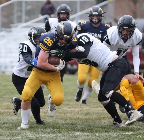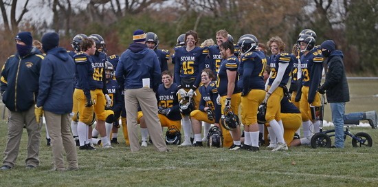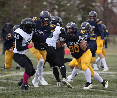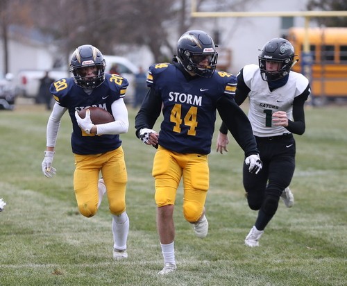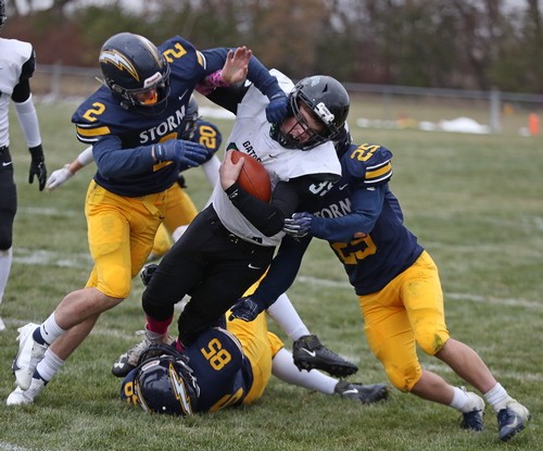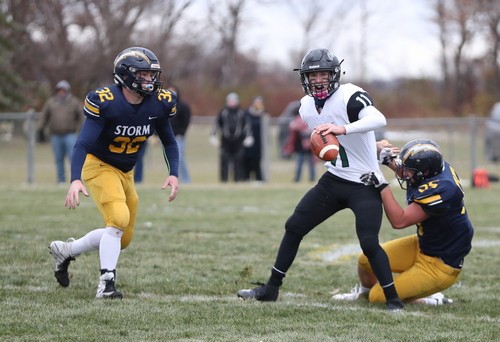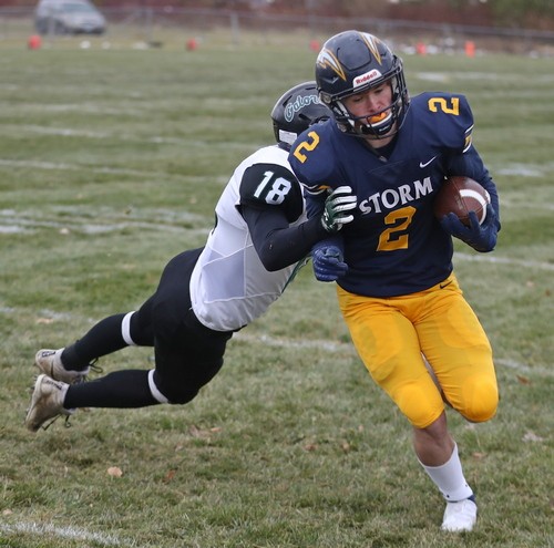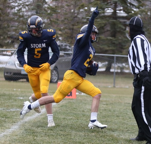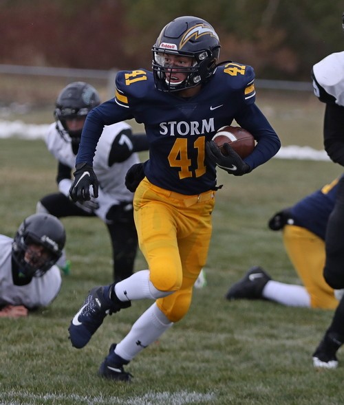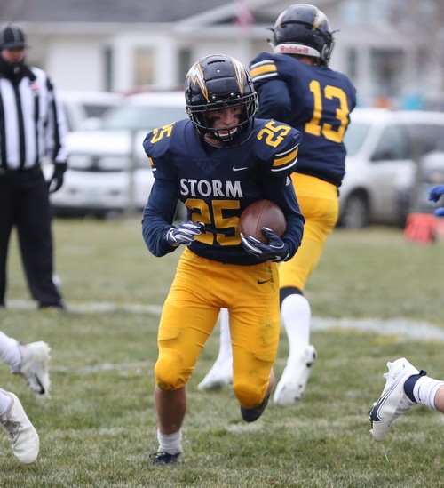 Faced with a second-and-goal at the three, McGlynn went to the air and found senior Brandon Kroll wide open on a simple angle route, and another Kasprowciz PAT put the Storm ahead 49-7 with 11:30 to play. The Gators refused to quit, however. Starting at their own 37 with 10:53 left, Kasen Swenson went to the air on the second play of the drive and found a wide-open Kobey Dallager down the sideline for a 61-yard touchdown reception. After forcing the Storm to go three-and-out on the following drive, the Gators quickly got the ball back and went long once again. This time, on the first play of the drive, Swenson hit Dallager wide open at midfield, and Dallager took it the rest of the way for a 74-yard touchdown catch. The Storm got the ball back with 4:36 remaining and had most of their second-string offense in at this point. After another series of successful run plays, a bad snap resulted in a Stephen-Argyle fumble, and the Gators recovered right at midfield. Three plays later, Swenson went back to their go-to play – throwing deep to Kobey Dallager. This time, Swenson found Dallager from 41 yards out, making it a 49-28 ballgame with just 52 seconds left. Dallager finished with six receptions for 212 yards and three touchdowns. The Gators managed to score 21 unanswered points in less than nine minutes during the final quarter, but Stephen-Argyle recovered the final kick, and backup QB Mason Rominski took a couple of kneel-downs to run out the remaining time.