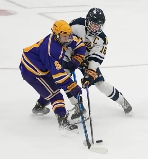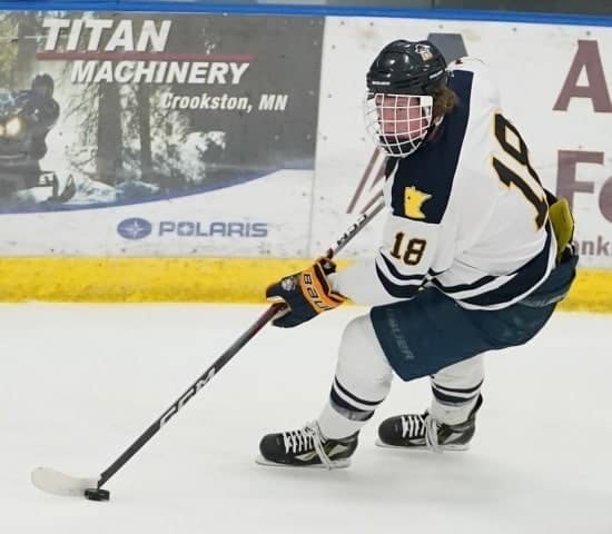 Crookston continued to pressure the International Falls net with shots from Miller and Masen Reitmeier deflected by Thompson 13:30 into the period. Kadin Edwards had a shot saved 14 minutes into the period, and Larson and Jay Reese had shots deflected 30 seconds later. The two teams were even from the last two minutes of the period before Trudeau, Lubinski, and Edwards had a three on two breakaway, but Edwards’ shot was saved, and the teams went into the second intermission tied at 1-1.