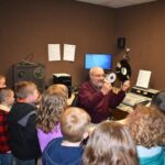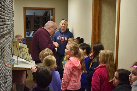 First graders at Washington Elementary were out touring and learning about different businesses downtown Thursday. Steve Krueger gave the students a history lesson from records and ad cartridges that the station used for many years to use to the modern technology for digital recording and the AP news wire used today.