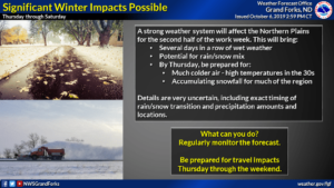 The National Weather Service in Grand Forks has issued an update on the strong weather system that is expected to bring a prolonged period of colder and wet weather to the northern plains this week. The announcement includes the following points: Low confidence in the details regarding precipitation – Exact timing of rain/snow transition(s) and […]