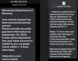 The Minnesota Department of Revenue is monitoring reported text messages that claim to be from the Minnesota Department of Revenue asking you to update banking information. If you get one of these messages, do not reply or click any link in it. We will never send unsolicited texts asking for personal data. Below is the content of the […]