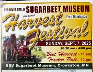The Red River Valley Sugar Beet Museum in Crookston will hold its 20th Annual Harvest Festival on Sunday, September 7, from 10:30 a.m. to 4:00 p.m. The public is invited, and admission is free. The beet harvesting starts at 11:00 a.m. and the tractor pull begins at Noon. There will be old vintage machinery, including […]