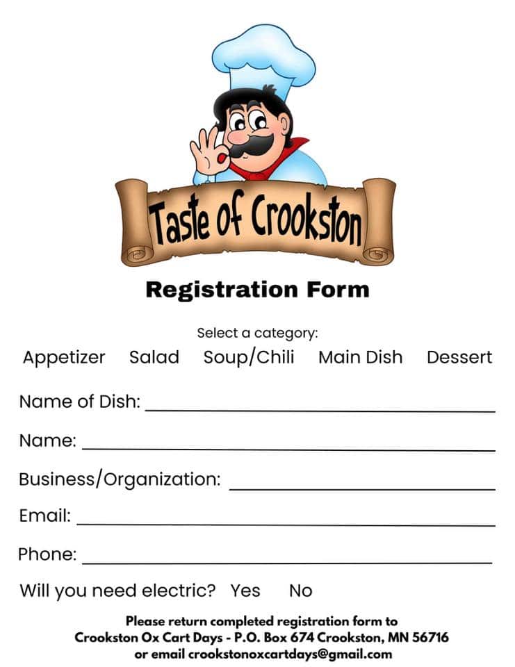 The Ox Cart Days kick-off event, the Taste of Crookston (sponsored by United Valley Bank), will be held Monday, August 11, at the Crookston Eagles Club from 5:00 to 7:00 p.m. There is a cost to get in, even with an Ox Cart Days button.
